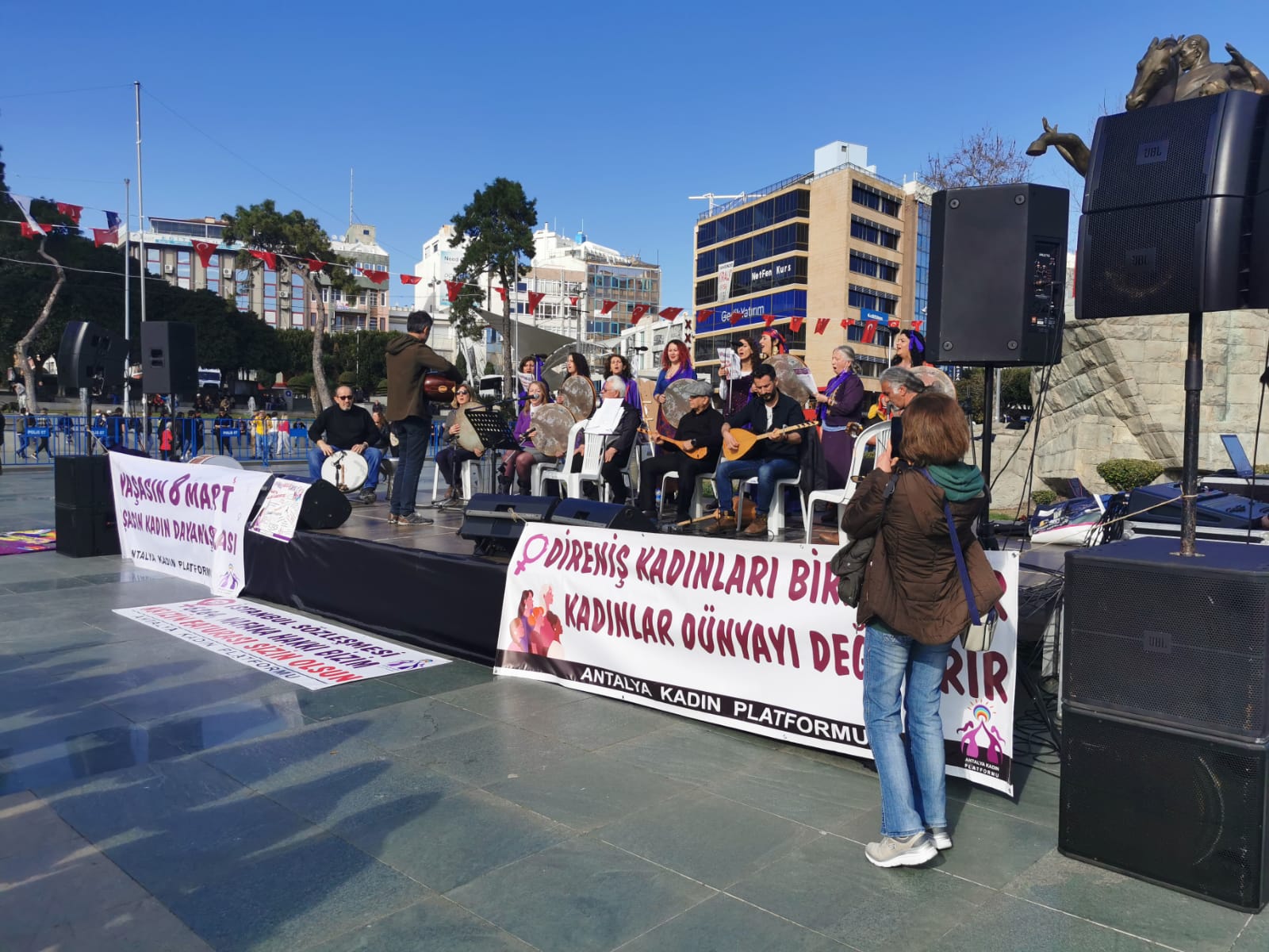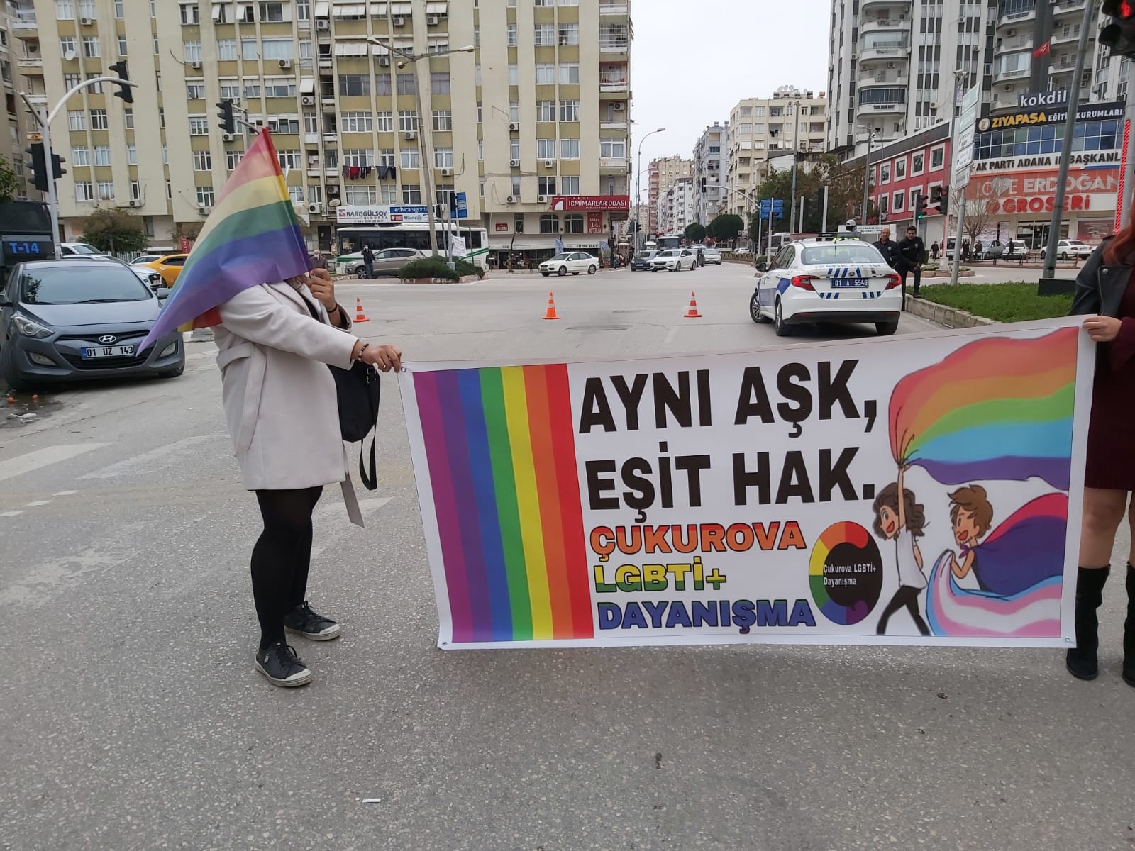 Adana Kadın Platformu’nun çağrısıyla saat 14.00’te kadınlar Kasım Gürlek Köprüsü’nde bir araya gelerek Uğur Mumcu Parkı’na yürüdü. Burada yapılan mitinge polis Çukurova LGBTİ+ Dayanışmasının pankartını ” LGBTİ+” yazdığı gerekçesiyle almadı. ” LGBTİ+” ifadesinin kesilmesini istedi. Oturma eylemi yapan kadınlar panklart alana alınana kadar miting alanına girmeyi reddetti. Kadınların ve LGBTİ+’ların direnişi sonucunda pankart içeri alındı.