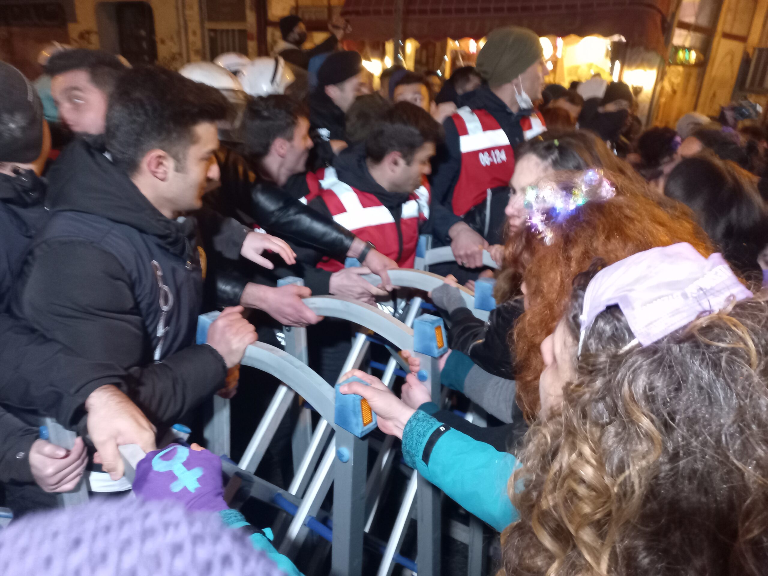 Yürüyüş öncesi Feminist Mekan’ın bulunduğu Tel Sokak polis tarafından kapatıldı. Kadınlar ve LGBTİ+’lar “Aç aç, barikatı aç!” sloganlarıyla polise tepki gösterdi.