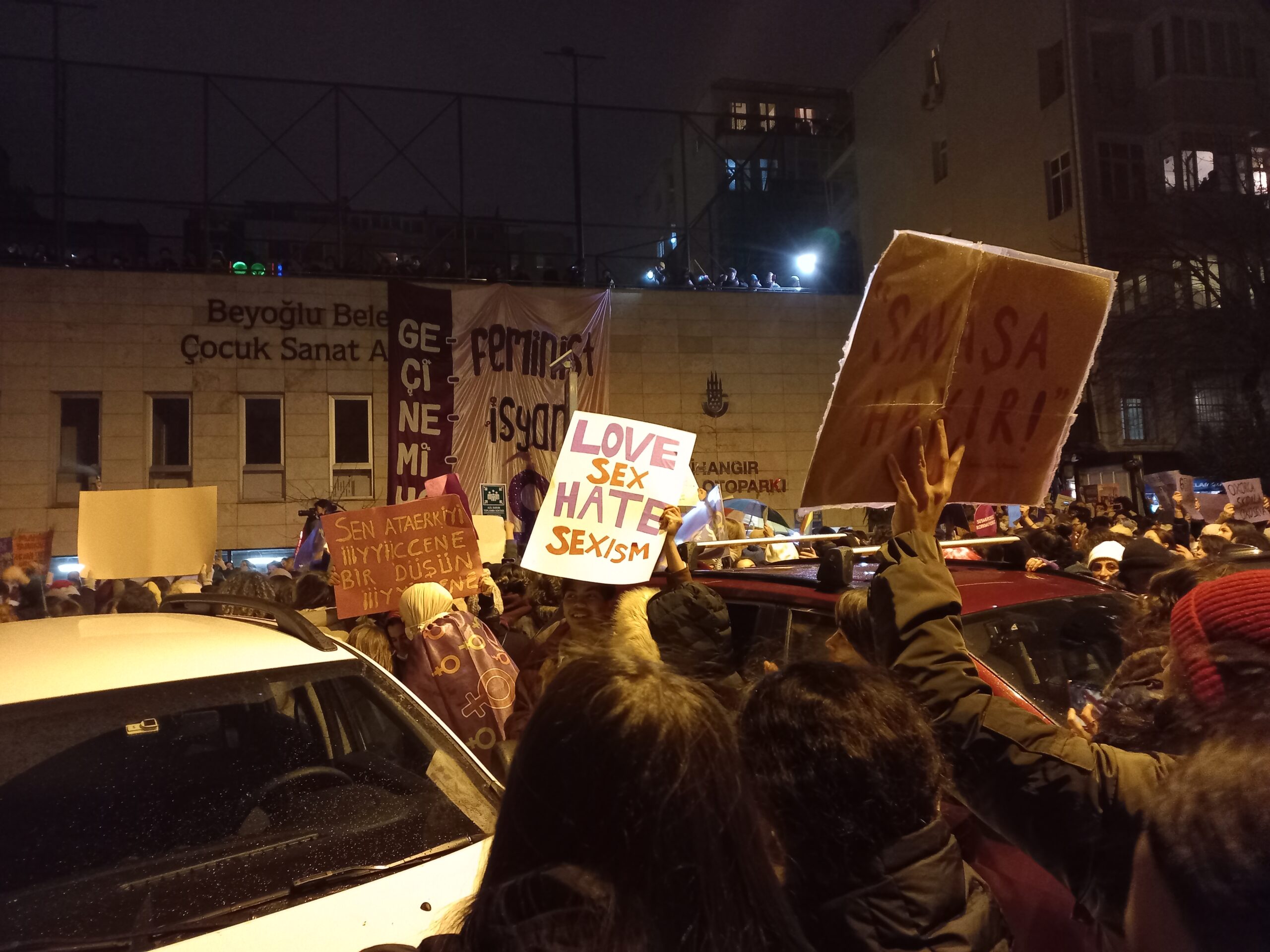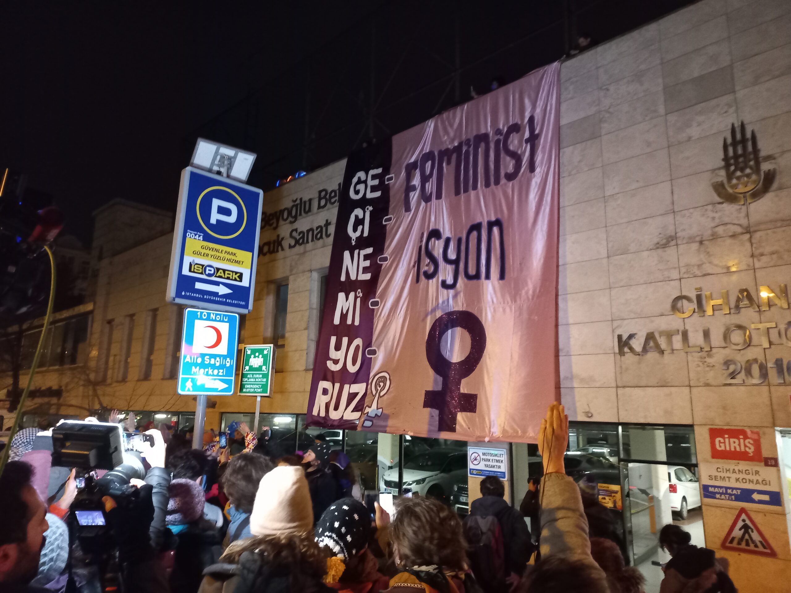 Cihangir’de 20. Feminist Gece Yürüyüşü açıklaması Kürtçe, Türkçe ve Arapça okundu. “Feminist isyan bitmeyecek” başlıklı açıklamada, feminst bir dünya kurana kadar sokaklardan isyan ve mücadelenin eksik olmayacağı belirtilerek “Patriyarkanın, kapitalizmin, ırkçılığın, savaşın, işgalin, dini baskının, emek sömürüsünün olmadığı eşit ve özgür bir dünya kurmadan feminist isyan bitmeyecek! Yaşasın feminist mücadelemiz!” denildi.
