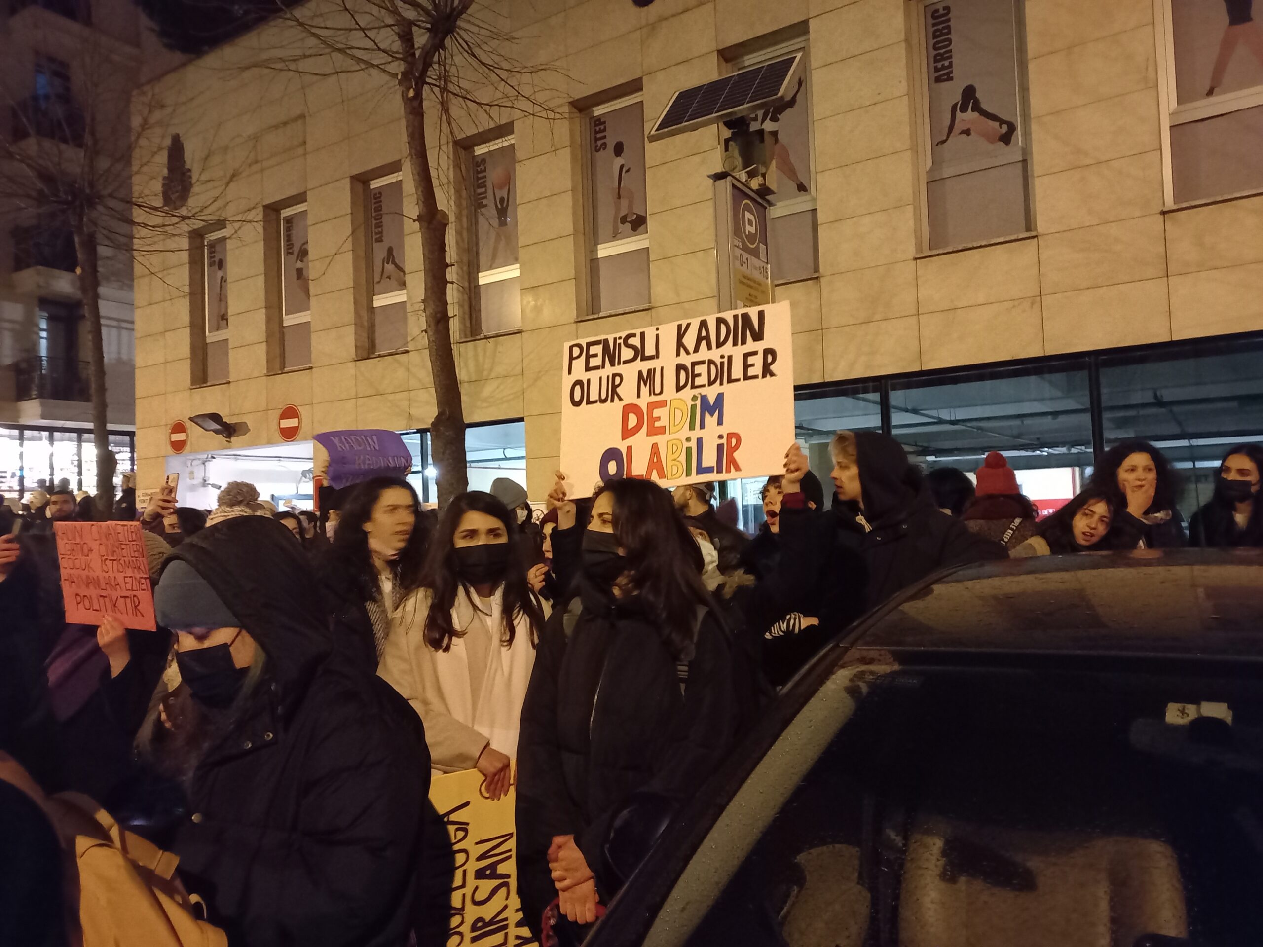 Tel Sokak’ta bulunan Feminist Mekan önünde toplanan kadınlar ve LGBTİ+’lar “Geceleri de sokakları da meydanları da terk etmiyoruz!” sloganı atıyor.