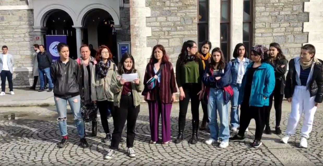 Boğaziçi Üniversitesi öğrencilerinden bir kadının sosyal medya paylaşımlarını gerici tacizci faşist sosyal medya trollerinin hedef göstermesi üzerine öğrenciler bugün (21 Nisan) eylemdeydi.