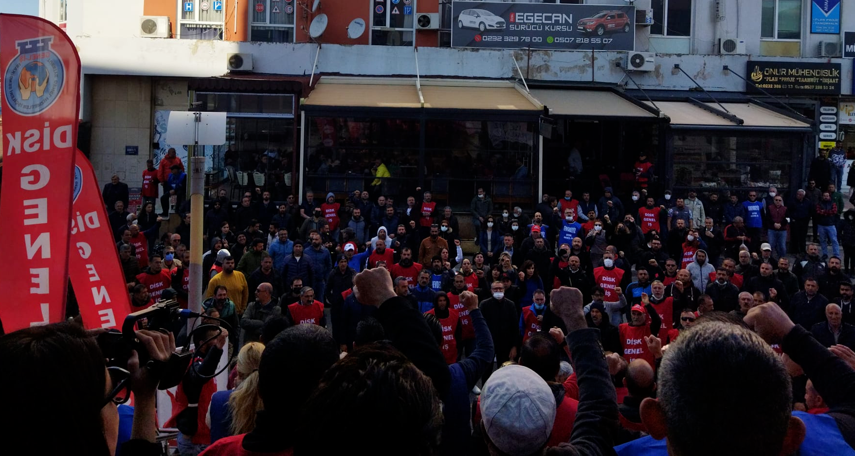 Çiğli Belediyesi’ne bağlı ÇİBEL A.Ş. işçileri, toplu sözleşme sürecinin tıkanmasından sonra çıktıkları grevin altıncı gününde yeniden belediye binası önünde buluştu.