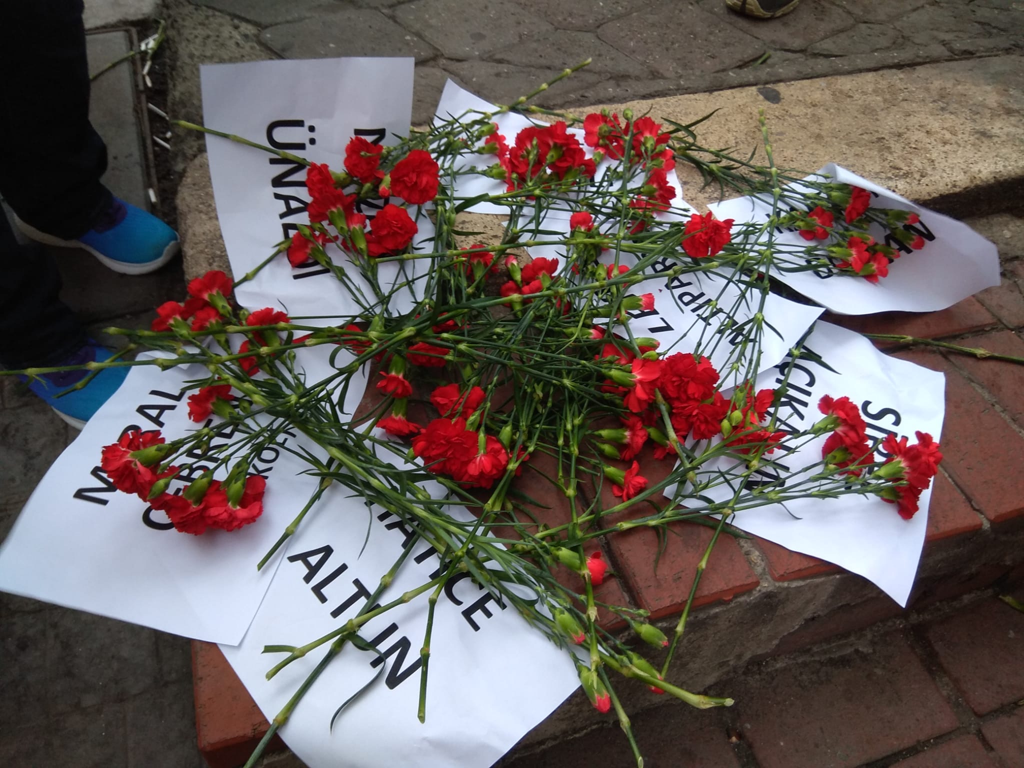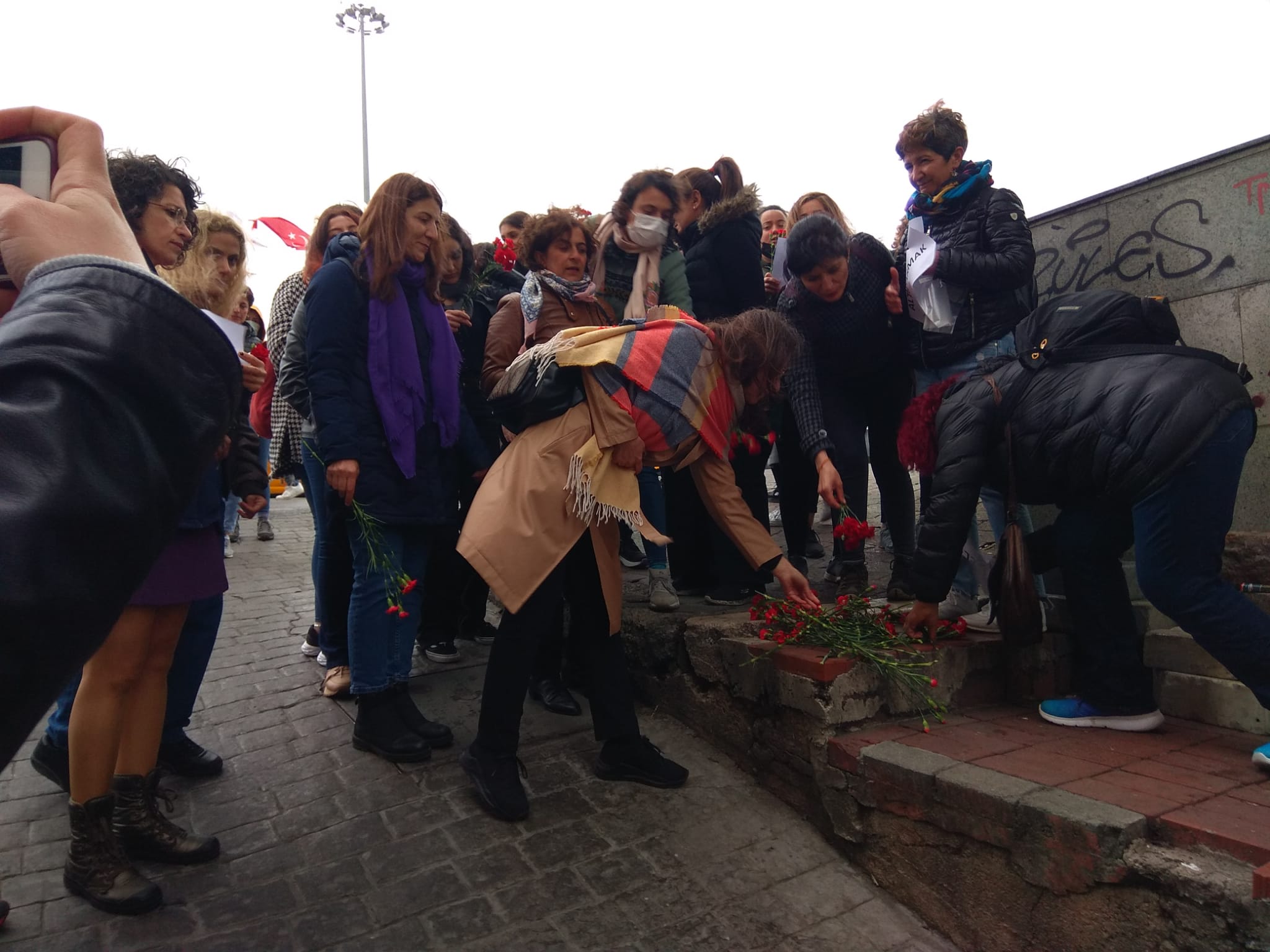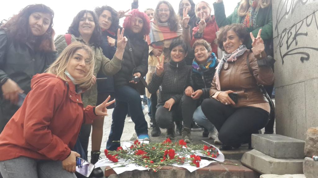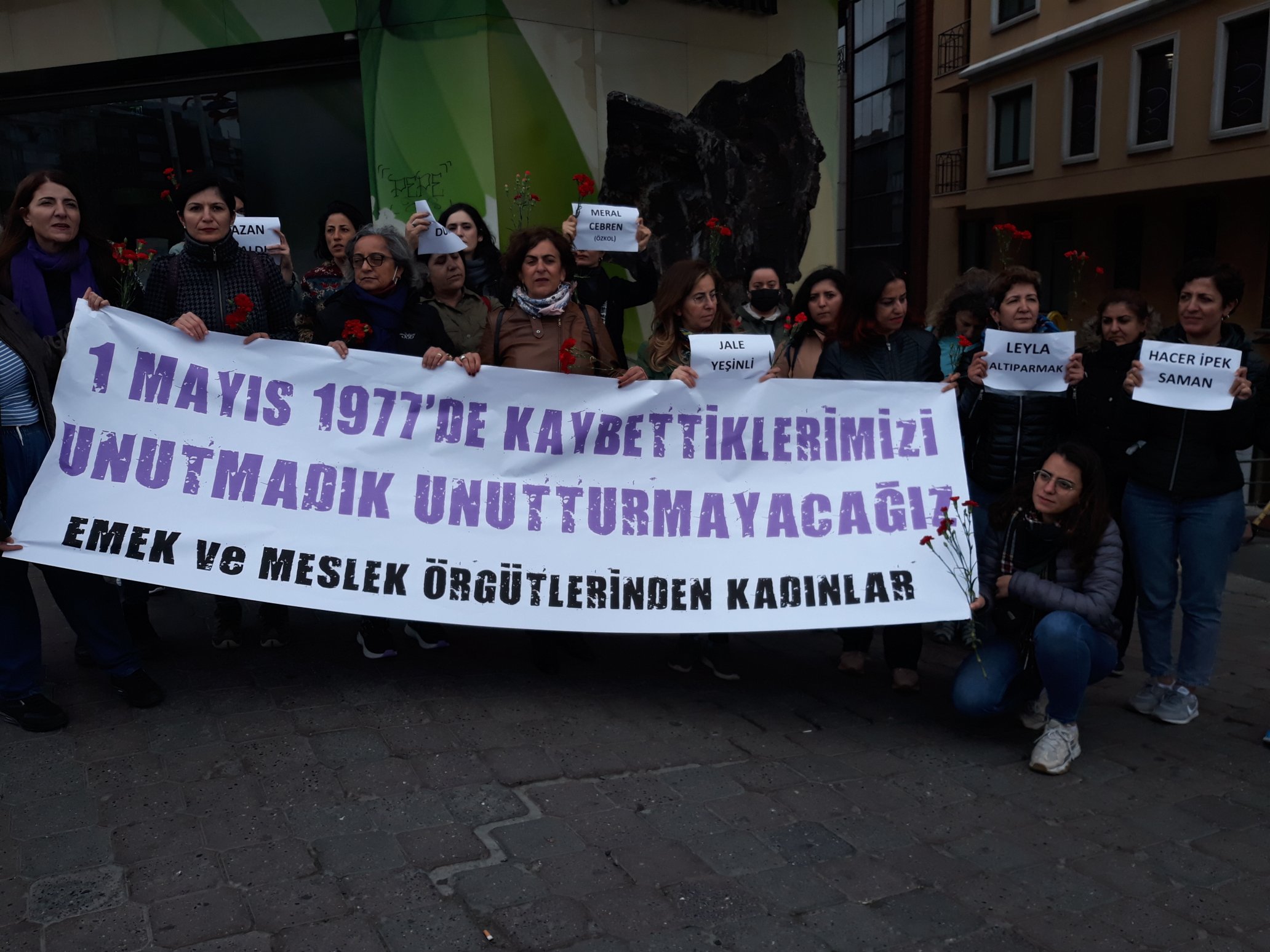 Bizler İstanbul Emek Meslek Örgütlerinden kadınlar olarak 1 Mayıs 1977’de bu meydanda yaşamını yitiren işçi kadınları ve o gün kaybettiğimiz tüm sınıf kardeşlerimizin anılarını yaşatmak, özlem duyduğumuz bir başka dünyayı kurma özgürlük ve eşitlik mücadelesinde kaybettiğimiz kadınları anmak için Taksim Meydanı’ndayız.”