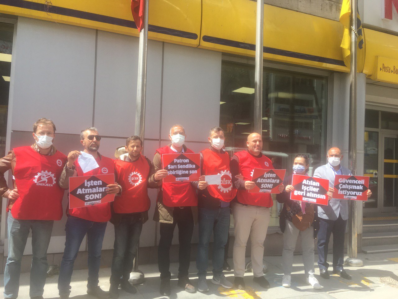 Sarı sendika TES-İŞ’ten DİSK/Enerji-Sen’e geçmelerinin ardından hukuksuz şekilde işten atılan EnerjiSA işçileri, dört haftadır sürdürdükleri direnişlerini, yaşadıklarını, neden DİSK/Enerji-Sen’e geçtiklerini anlattıkları mektuplarını Güler Sabancı’ya atmak için Mithatpaşa Caddesi üzerinde bulunan PTT Yenşiehir Şubesi önünde buluştu.