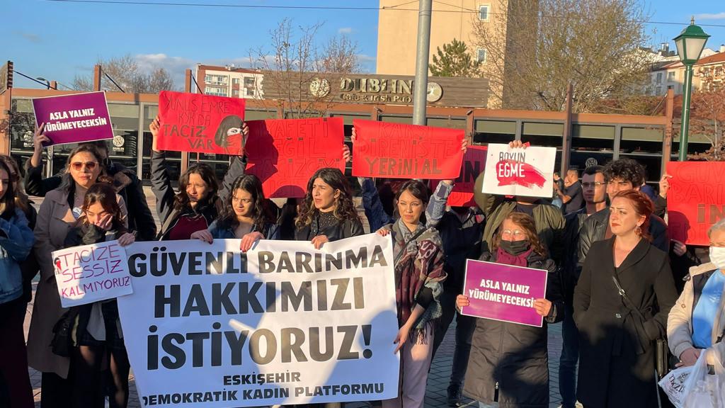 Eskişehir’de Yunus Emre KYK Kız Öğrenci Yurdu’na “tesisatçıyım” diyerek giren bir kişinin bir kadın öğrenciyi taciz etmesinin ardından Eskişihir Demokratik Kadın Platformu Ulus Anıtı önünde eylem yaptı
