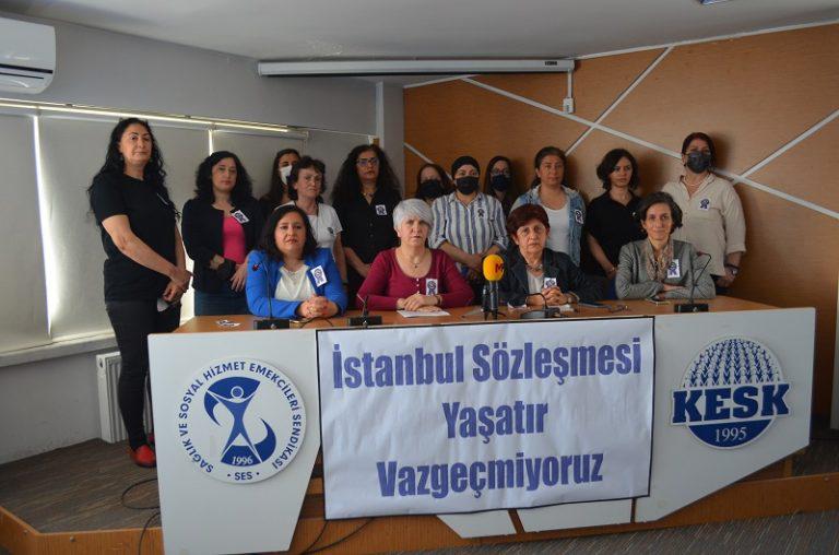 İstanbul Sözleşmesi’nden Erdoğan’ın kararnamesinin iptali istemiyle açılan davaların Danıştay’da görülmesinin öncesinde KESK MYK ve KESK Ankara Şubeler Platformu üyeleri ile birlikte SES Genel Merkezi’nde açıklama yapıldı. Açıklamada “Bu yaşamı sağlamak için İstanbul Sözleşmesi’ni savunmaktan, sözleşmenin ve 6284 sayılı yasanın etkin uygulanması ve ILO 190 sayılı sözleşmenin imzalanması için mücadelede kararlıyız” denildi