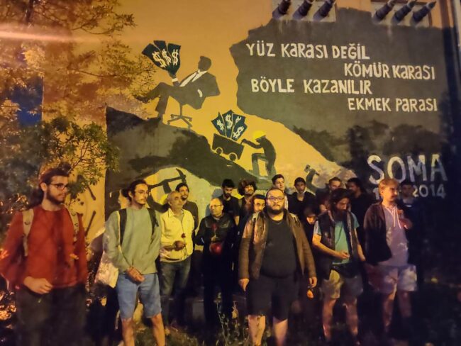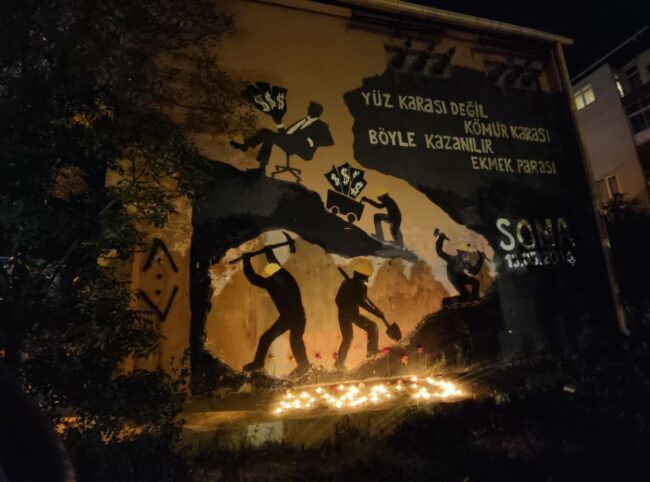 100. Yıl İnisiyatifi’nin çağrısıyla Soma katliamı anısına çizim yapılan trafo önünde buluşan mahalleliler ve ODTÜ öğrencileri, çizimin önüne katliamda yaşamını yitirenler anısına mumlar yakıp karanfiller bıraktı. Ardından açıklama yapıldı. Yapılan açıklamada maden faciasının kaza değil katliam, kader değil cinayet olduğunu; madencileri kimin yerde tekmelediğini iyi bildikleri ifade edildi. Bugün katliamla alakalı tutuklu tek bir kişinin bile bulunmadığını hatırlatarak dava avukatları olan Selçuk Kozağaçlı ve Can Atalay’ın cezaevinde olduğuna dikkat çekildi.