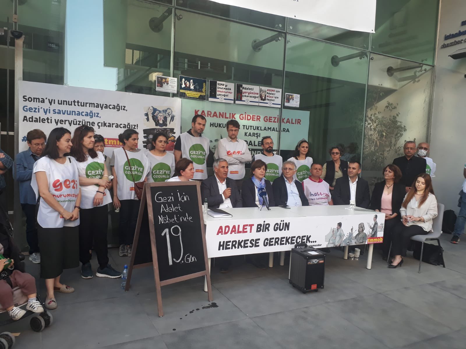 “Karanlık gider Gezi kalır. Hukuksuz tutuklamalara karşı adalet nöbetindeyiz” ve “Hepimiz Gezi’deydik. Gezi davasında verilen hukuksuz kararı tutuklamaları kabul etmiyoruz” pankartlarının binaya asıldığı nöbette bugün (14 Mayıs) 19. gün geride bırakıldı.