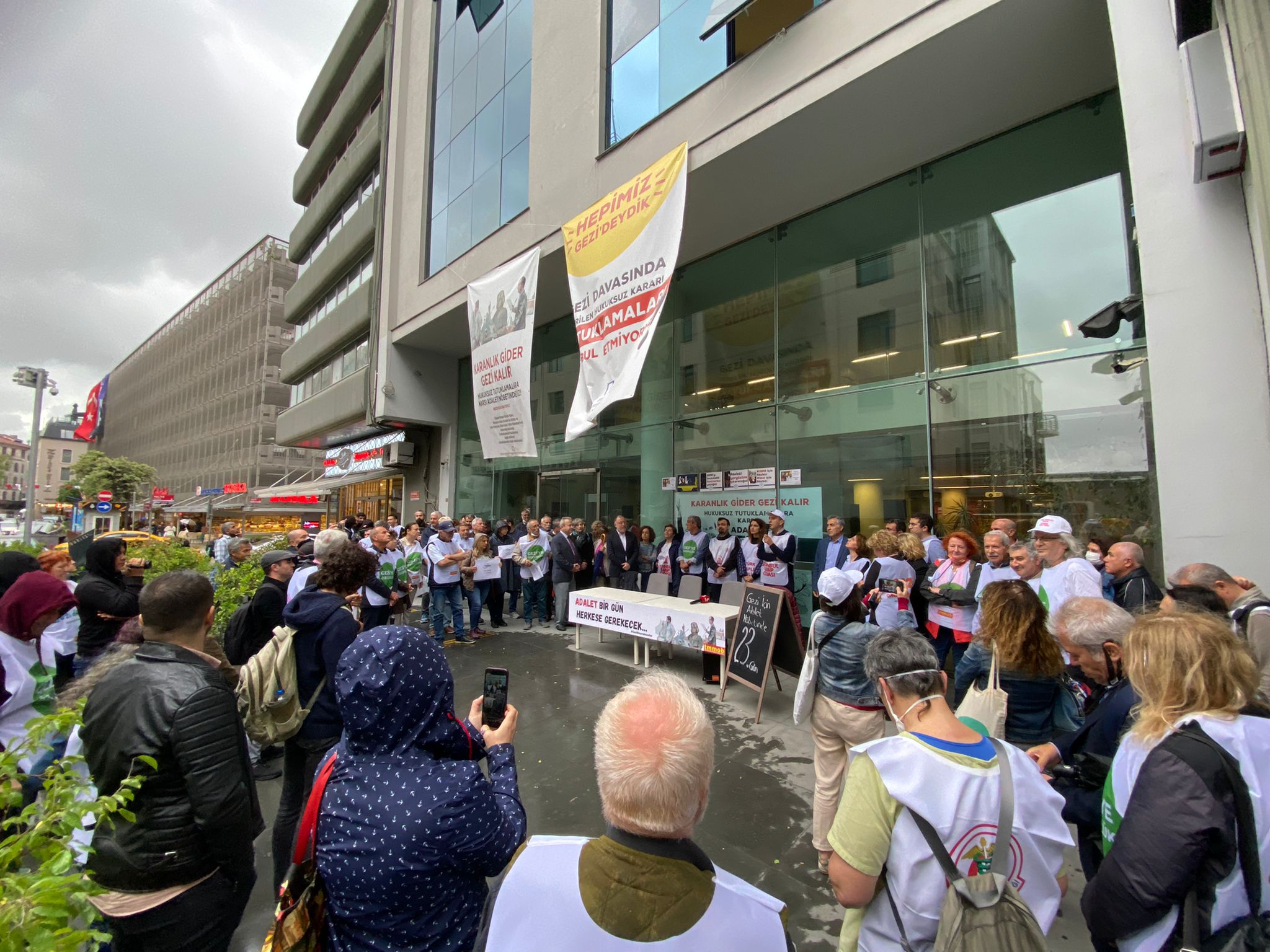 “Karanlık gider Gezi kalır. Hukuksuz tutuklamalara karşı adalet nöbetindeyiz” ve “Hepimiz Gezi’deydik. Gezi davasında verilen hukuksuz kararı tutuklamaları kabul etmiyoruz” pankartlarının binaya asıldığı nöbette bugün (18 Mayıs) 23. gün geride bırakıldı.