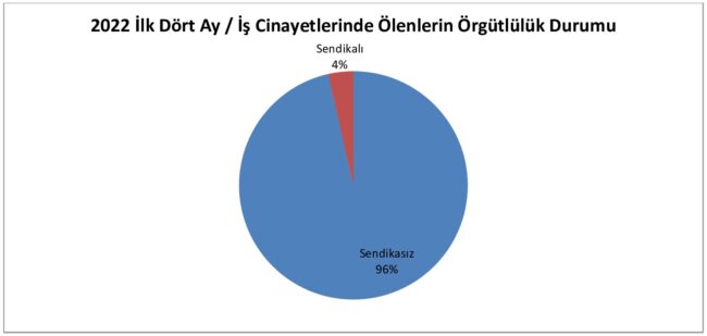8- Bu dört aylık süreçte 17 sendikalı işçi ölümü (yüzde 3,54) tespit edebildik. Elbette raporumuzun son kısmında isimlerine de yer verdiğimiz ölen işçi arkadaşlarımız içinde sendikalı sayısının fazla olduğunu biliyoruz. Ancak bu sendikal üyelik kağıt üzerinde kalıyor. Sendikaların bir kısmı üyelerinin iş cinayeti sonrası ölümünde herhangi bir açıklama yapmadığı için bir bilgiye ulaşmak zorlaşıyor.