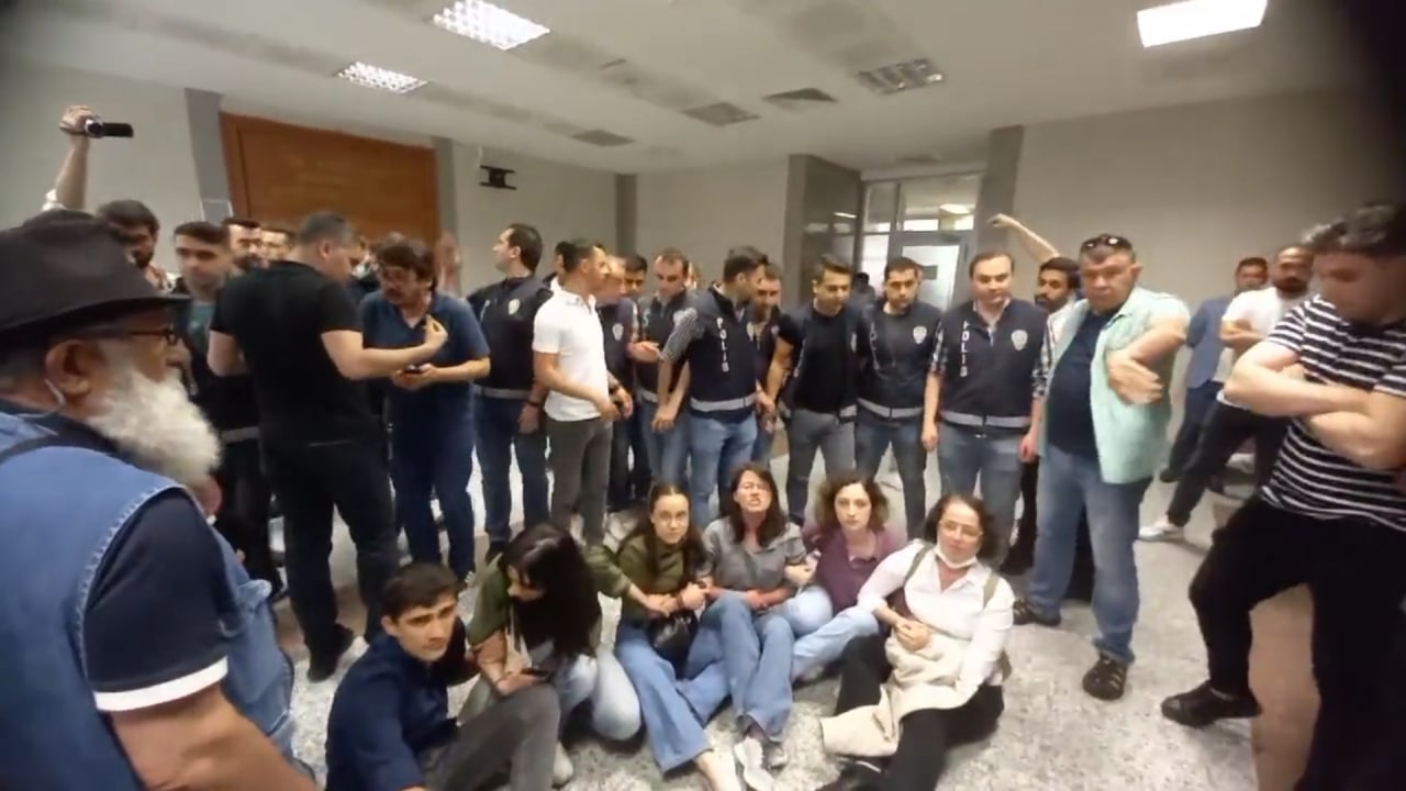 Akademisyen Nuriye Gülmen'e verilen 10 yıl hapis cezasını sloganlarla protesto eden kardeşi Beyza Gülmen ve izleyicilere polis ve özel güvenlik saldırdı. Zorla duruşma salonundan çıkarılan izleyiciler oturma eylemi başlattı.#NuriyeTahliyeEdilmeli pic.twitter.com/kQ30rYVvIY