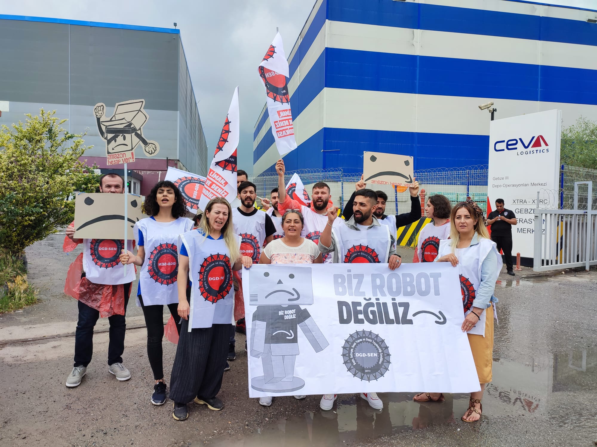 Dünyanın pek çok ülkesinde depoları bulunan Amazon’un Türkiye ayağında Ceva Lojistik bulunuyor. Gebze Dilovası bölgesindeki Ceva Lojistik’in üç deposu, Amazon’un Türkiye’deki tek deposu olarak faaliyette. Yaklaşık 3 bin kişinin çalıştığı bu depolarda yoğun mesai ve düşük ücretlerle çalıştırılan işçiler DGD-Sen’de örgütlenmeye karar verdi. Bu nedenle geçen ay işten çıkarılan işçiler 7 Haziran günü Amazon depo önüne giderek, depo işçilerine seslenip örgütlenme çağrısı yaptı. İşçiler sendikal örgütlenme üzerindeki baskıların kalkmasını istedi, patronlarına “Biz robot değiliz” diye seslendi.