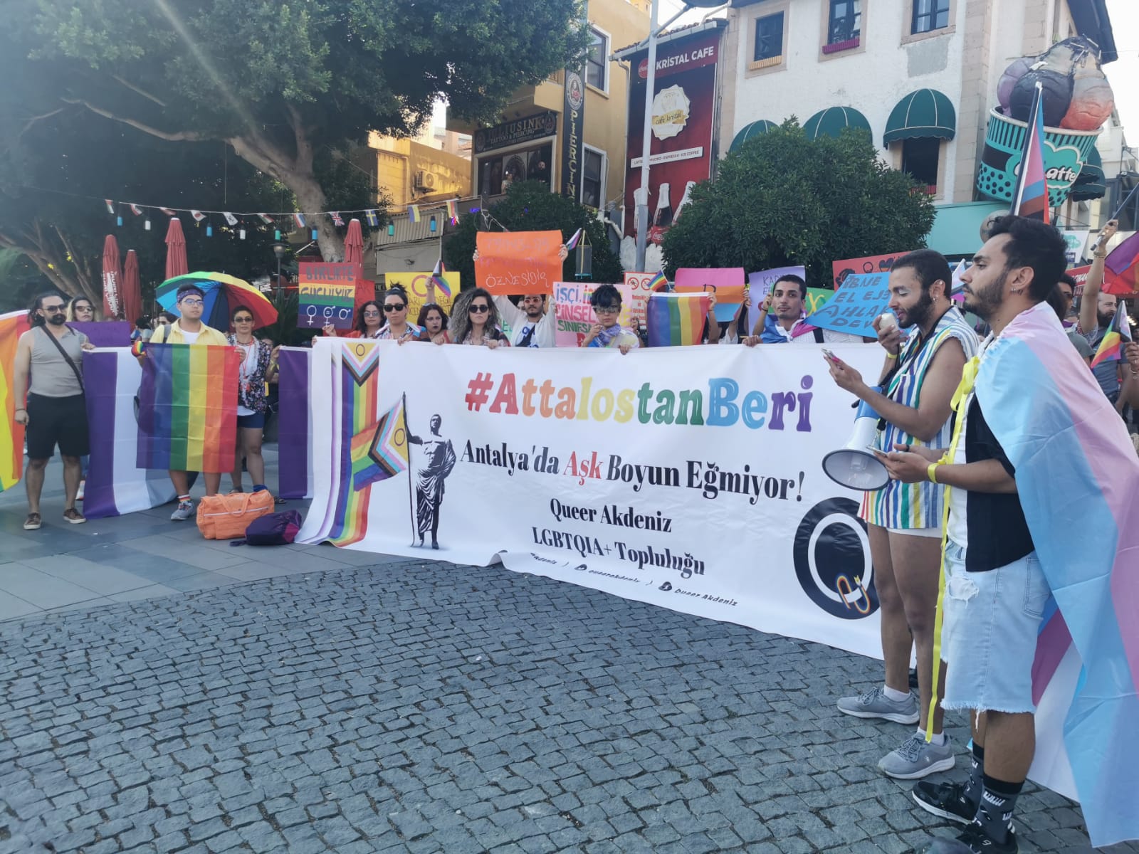 Queer Akdeniz’in çağrısıyla saat 17.30’da Attalos Meydanı’nda bir araya gelen LGBTİ+’lar gökkuşağı bayrakları ile “#AttalostanBeri Antalya’da aşk boyun eğmiyor” yazılı pankart açarak eylem yaptı.