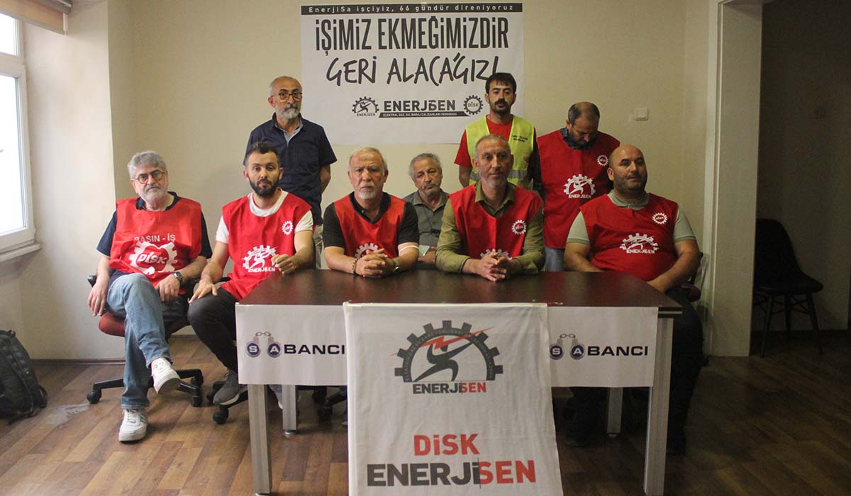 Sendikalı oldukları için işten çıkarılan EnerjiSA işçileri, direnişlerinin 66. gününde örgütlü oldukları DİSK/Enerji-Sen Genel Merkezi’nde basın toplantısı düzenledi. Emek dostlarına ve Sabancı yöneticilerine seslenen Genel Başkan Süleyman Keskin, şirketin verdiği sözleri tutmasını isteyerek, tüm emek dostlarını 3 Haziran Cuma günü Sabancı Holding’in önünde yapacakları açıklamaya çağırdı