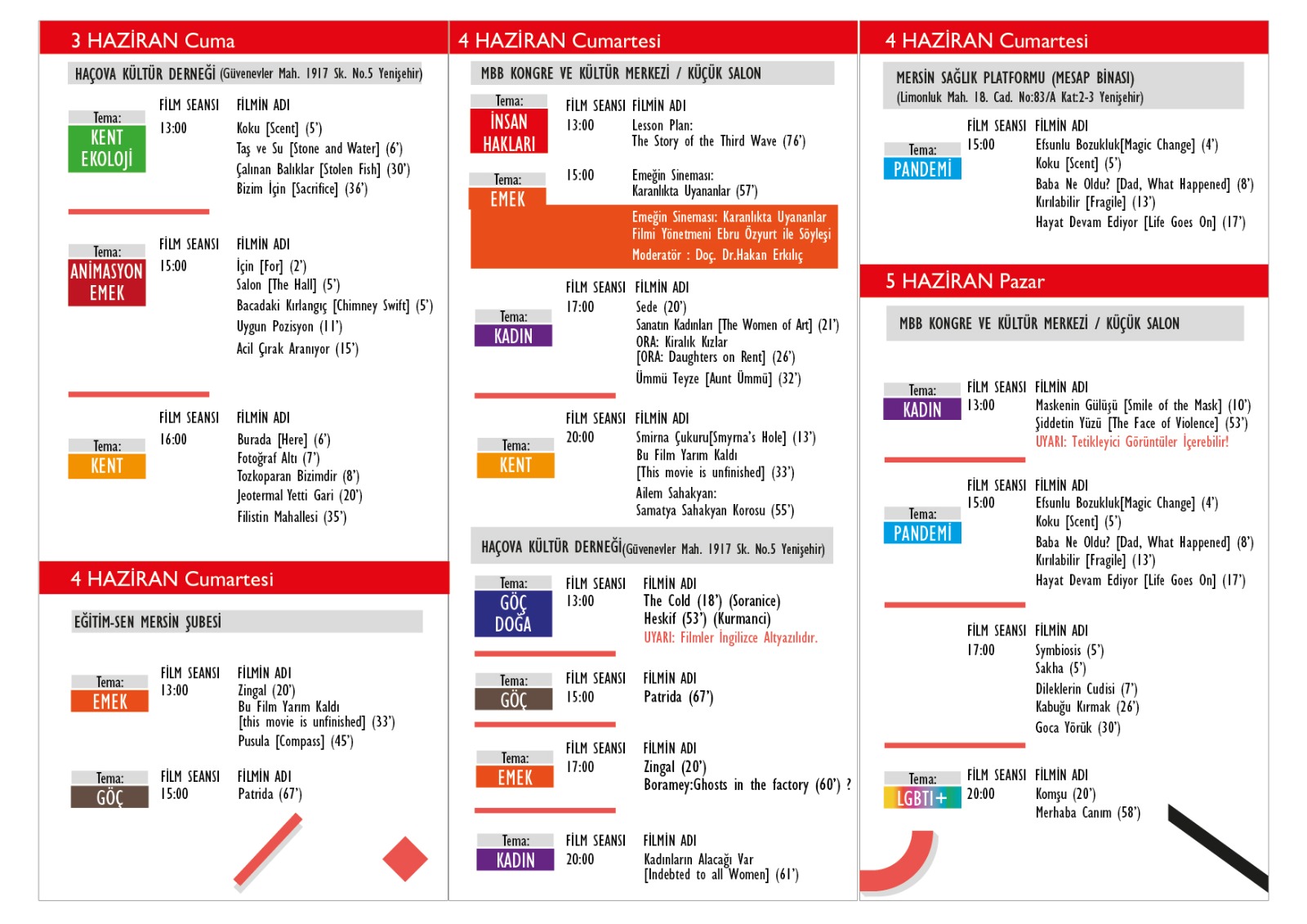 3-4-5 Haziran’da ise çeşitli salonlarda tüm gün film gösterimleri devam edecek. Reklamsız, sponsorsuz ve ücretsiz bir şekilde gerçekleştirilen festival 2 yılın ardından Mersin halkı ile buluşacak. Festival Mersin Halkevi, 68’liler Derneği, Haçova Kültür Derneği ve birçok gönüllünün emeği ile düzenleniyor. Destekleyen ise birçok sendika, meslek odaları ve belediye var. Festival düzenleme kurulu herkesi açılış gecesine ve diğer gösterim günlerine davet ediyor.
