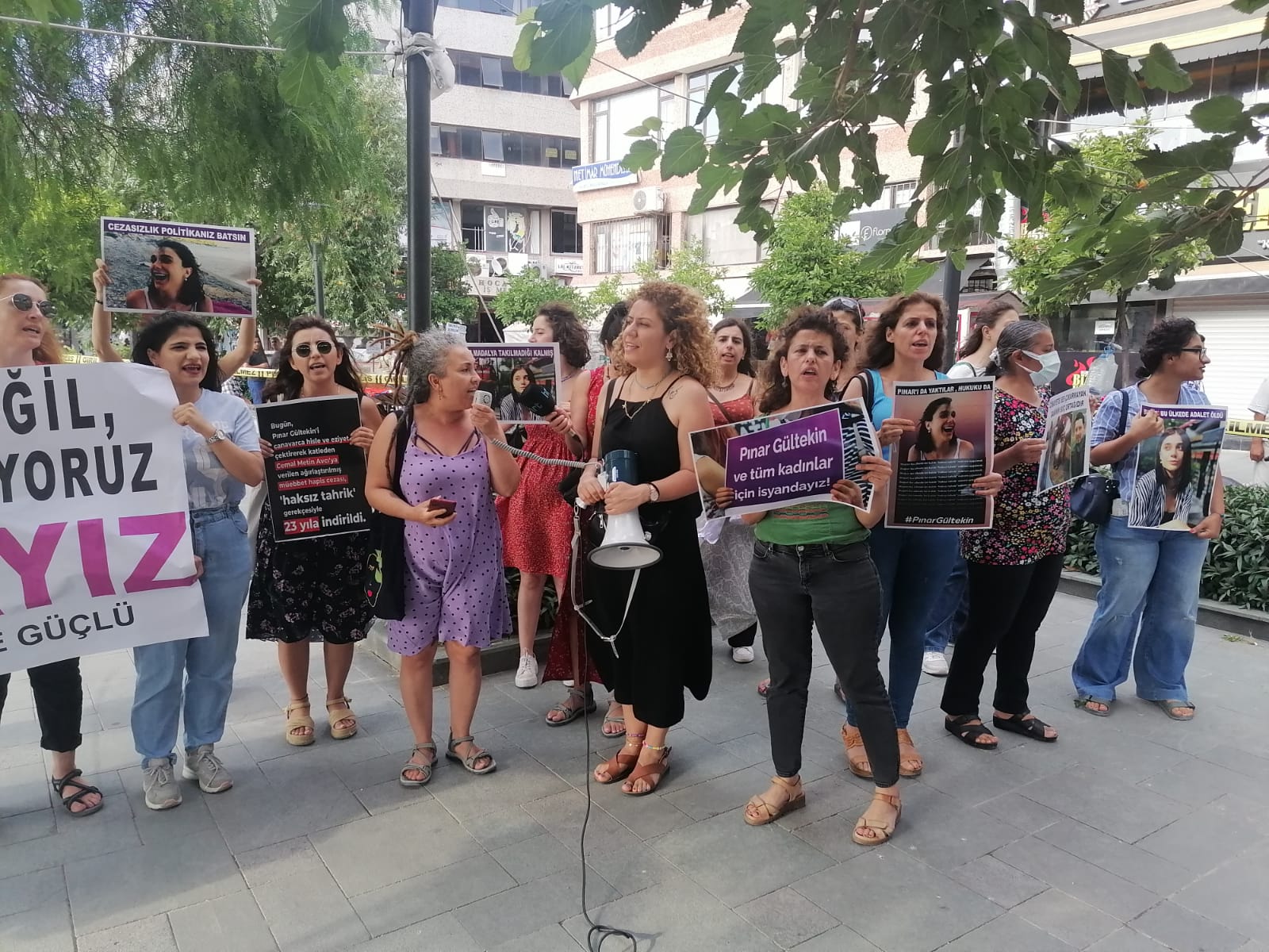 Ardından okunan açıklamada erkek yargının hayatını savunan Nevin Yıldırım’a müebbet hapis cezası verdiği söylenerek “Faillerin sırtını sıvazlayarak, haksız tahrik indirimleri vererek, cezasız bırakarak kadın cinayetlerinin günbegün daha çok önünü açıyor. Kadınların yaşamlarını güvencesiz ve tehdit altında bırakıyor. İktidarın kürsülerden söylediği bunlar çürük ve sürtük söylemleri, biz kadınlara yargılamalar sırasında yöneltilen ‘onun evine gitmeseymiş’, ‘o eteği giymeseymiş’, ‘o saatte orada ne işi varmış’ sorularıyla tezahür ediyor. Tam da bu yüzden Pınar Gültekin davasında failden çok Pınar’ın yaşam tarzının yargılanmasının tesadüf olmadığını biliyoruz. Bugün yargının bu kararından, istanbul sözleşmesini kaldıran, kadınların kazanımlarına saldıran, her gün kadın düşmanı söylemler ile erkekliği yeniden üreten iktidar yaygınlaşan erkek şiddetinin sorumlusudur. Son bir buçuk senede 599 kadın öldürülmesine rağmen, 6284’ü etkin uygulamayan iktidar kadın cinayetlerinin sorumlusudur” denildi.