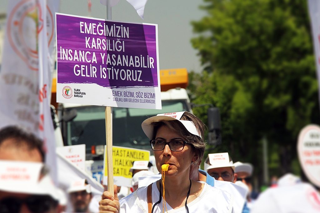 Sağlıkta Dönüşüm Programı ile piyasalaşan; hastaya müşteri, hastanelere işletme ve bizlere de köle gözüyle bakılan Türkiye sağlık sistemi; pandemi ve krizlerin etkisiyle gittikçe tıkanmaktadır. Sağlık sistemindeki tıkanmışlığının çözümü için ise sistemi gözden geçirip değiştirmek yerine; yaşananlardan ders alınmamışçasına, çalışanların üzerine daha fazla yüklenilmektedir. Çalışanların ücretleri her geçen ay erirken çalışma şartları daha da zorlaşmaktadır. Hekimlerin büyük çoğunluğu yoksulluk sınırının altında ücret alırken, her gün sağlık kurumlarında yaşanan kaos ortamını idare etmek zorunda kalmaktadırlar. Dayanılmaz hale gelen koşullar sonucu son iki yılda binlerce hekim kamudan istifa etmiş ve yine binlercesi yurt dışına gitmektedir. Uzun süredir nitelikli sağlık hizmeti alamayan toplum; artık hekim bulamamaktadır.