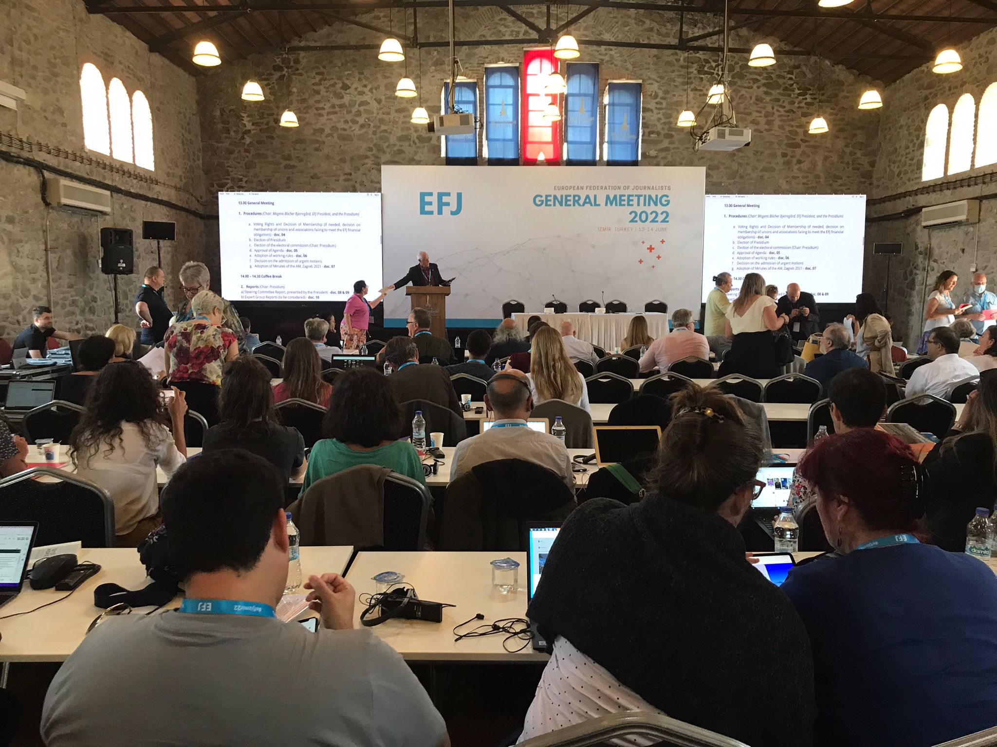 Avrupa Gazeteciler Federasyonu’nun (EFJ) 12’nci Genel Kurulu 13-14 Haziran tarihlerinde İzmir’de gerçekleşti. Türkiye’den Türkiye Gazeteciler Cemiyeti (TGC), DİSK Basın İş, Türkiye Gazeteciler Sendikası (TGS) ve Gazeteciler Cemiyeti’nin katıldığı Genel Kurul’da Avrupa’daki 300 bini aşkın gazeteciyi temsilen 150’ye yakın delege katıldı.