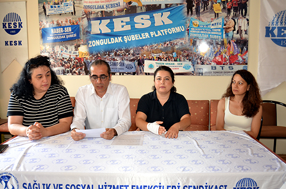 KESK’e Bağlı SES Zonguldak Şubesinde yapılan basın açıklamasına SES Zonguldak Şube Eş Başkanları Aytekin Aygün, Döndü Temel ve SES Yönetim Kurulu Üyesi Muazzez Derya Akar ile şiddete uğrayan Duygu Güneş katıldı. Açıklamayı SES Zonguldak Şube Eş Başkanı Aytekin Aygün yaptı.
