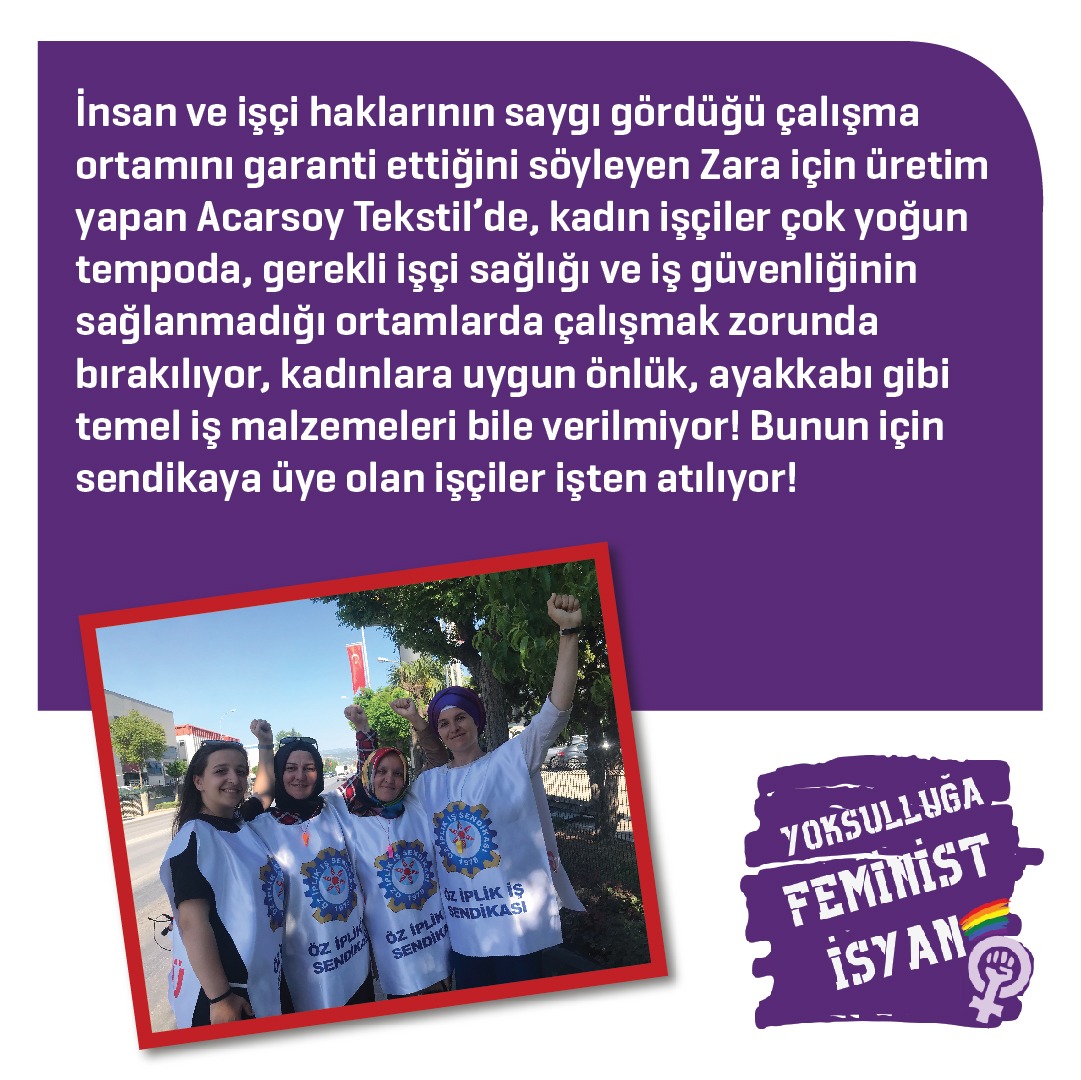 - İnsan ve işçi haklarının saygı gördüğü çalışma ortamını garanti ettiğini söyleyen Zara için üretim yapan Acarsoy Tekstil’de, kadın işçiler çok yoğun tempoda, gerekli iş sağlığı ve güvenliğinin sağlanmadığı ortamlarda çalışmak zorunda bırakılıyor, kadınlara uygun önlük, ayakkabı gibi temel iş malzemeleri bile verilmiyor! Bunun için sendikaya üye olan işçiler işten atılıyor!