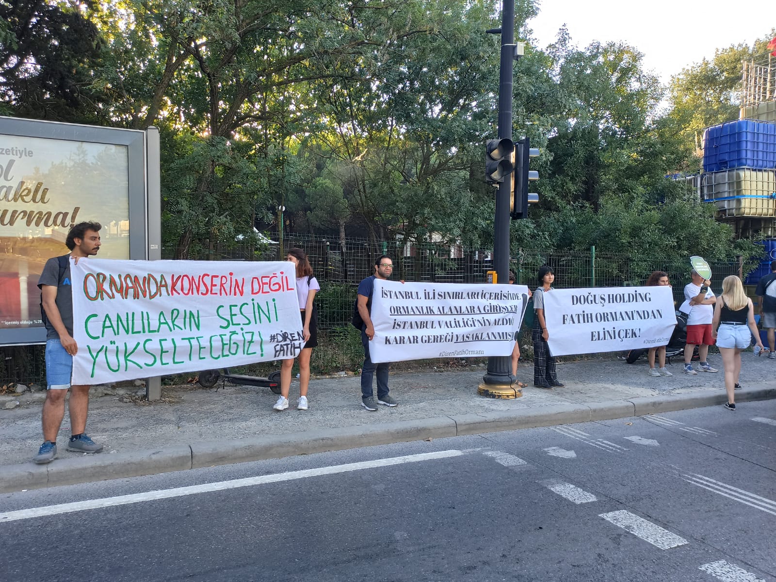 “Ormanda konserin değil canlıların sesini yükselteceğiz”, “Doğuş Holding Fatih Ormanı’ndan elini çek!” yazılı pankartların bulunduğu eylemde, ormana yapılan konser alanıyla birlikte ormandaki canlı yaşamının ve ekolojik dengenin altüst edildiği vurgulandı.