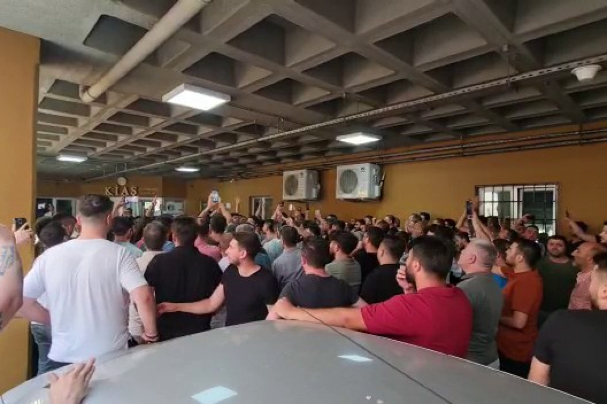 Yönetim binası önünde toplanan kalabalıktan temsilciler, yetkililerle görüşmek için yönetim binasına girerken güvenlik görevlileri geniş güvenlik önlemi aldı.