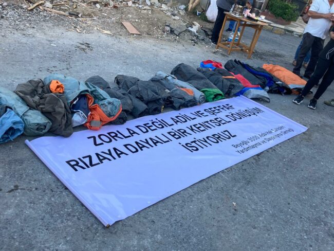 Okmeydanı Fetihtepe’de yürütülen kentsel dönüşüm zorbalığına karşı Fetihtepeliler yaşadıkları mağduriyete dikkat çekmek için kendilerine kira yardımı olarak sunulan 1950 liraya çadır kiralama temsili sergiledi, çamaşırlarını sokakta yıkadı