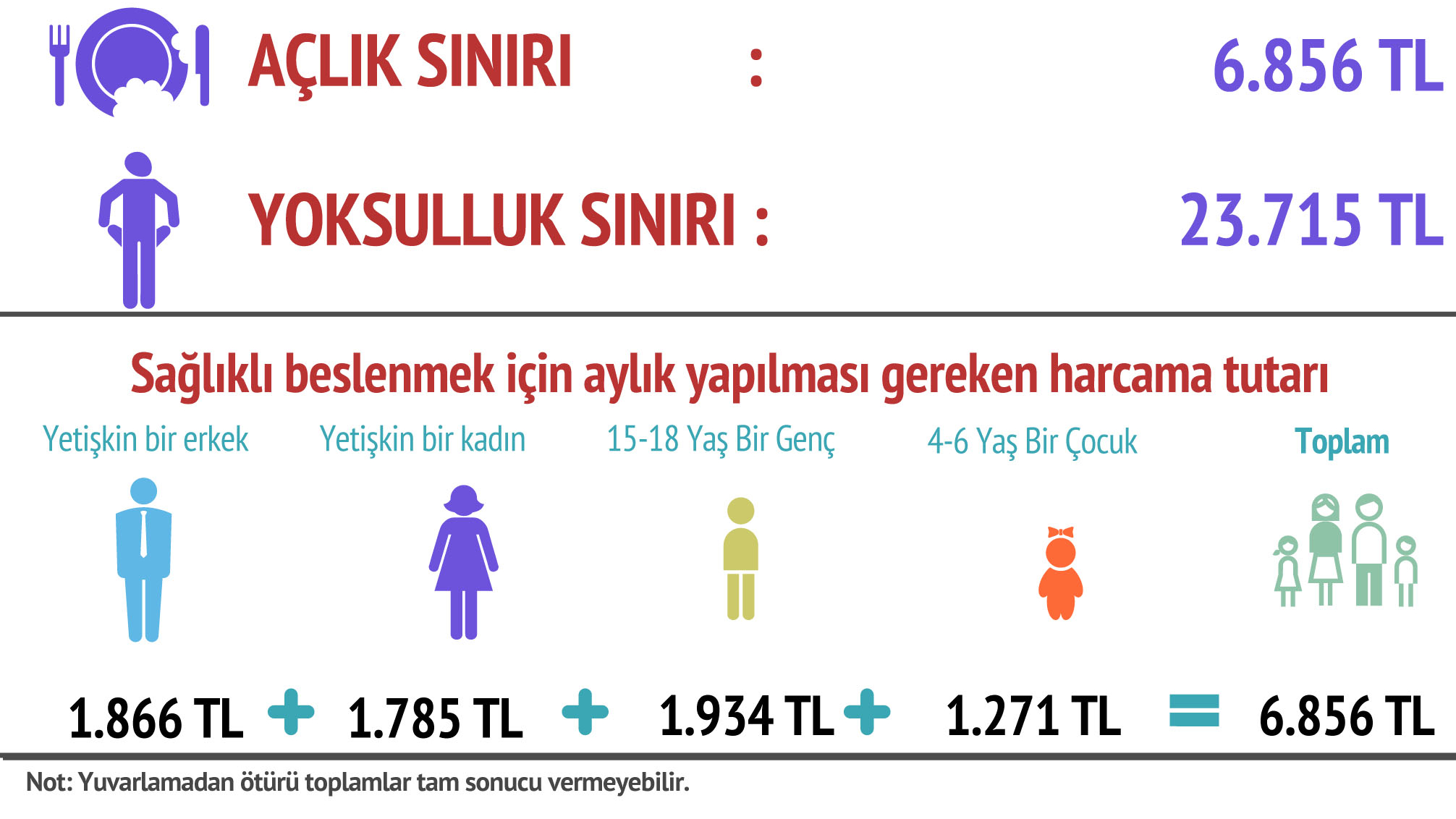 Birleşik Metal-İş Sınıf Araştırma Merkezi’nin araştırmasına göre dört kişilik bir ailenin bir aylık sağlıklı beslenme maliyeti 6 bin 856 lira. Yoksulluk sınırı ise 23 bin 715 lira