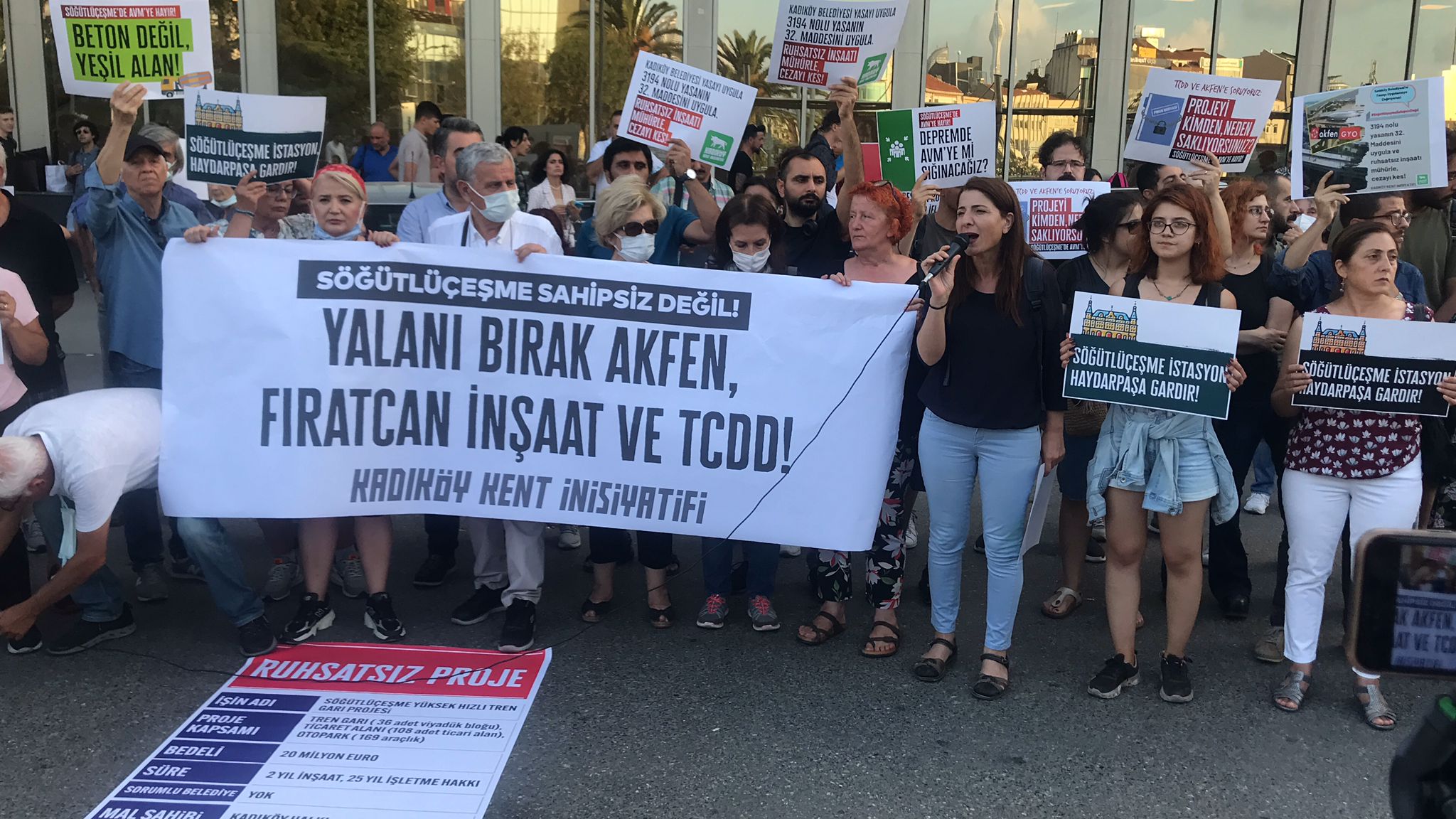 Gar önünde Kadıköy Kent İnisiyatifi’nin çağrısıyla yapılan basın açıklamasında “Beton değil yeşil alan”, Söğütlüçeşme istasyon, Haydarpaşa gardır”, “AVM değil nefes almak istiyoruz” dövizleri taşındı.