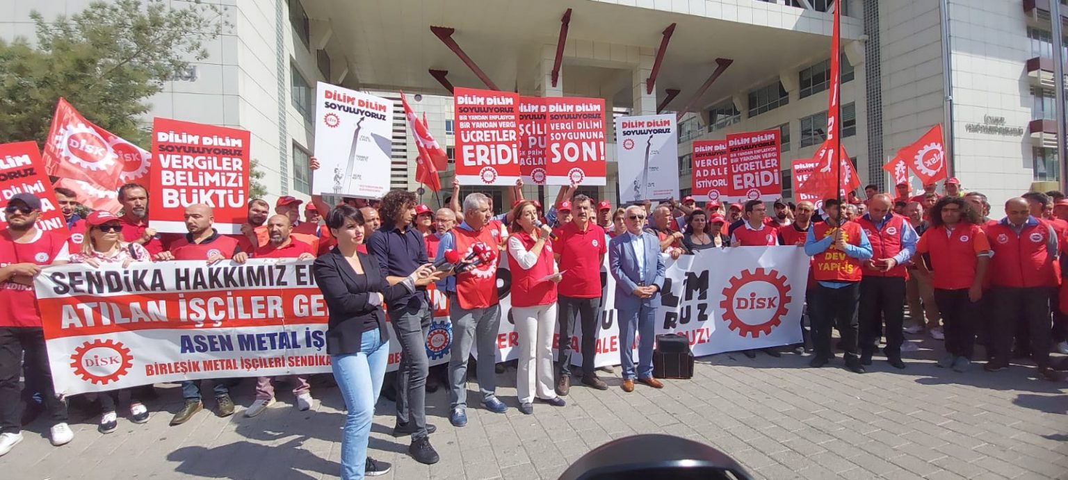 DİSK yeniden değerlenme oranın altında artırılan vergi dilmi oranları ile işçilerin maaşlarında yaşadıkları kayıplara karşı İstanbul Vergi Dairesi Başkanlığı önünde basın açıklaması yaptı. Açıklamaya DİSK Genel Başkanı Arzu Çerkezoğlu, DİSK Genel Sekreteri Adnan Serdaroğlu, DİSK Yönetim Kurulu üyeleri Kazım Doğan ve Seyit Aslan’ın yanı sıra DİSK üyesi işçiler katıldı.