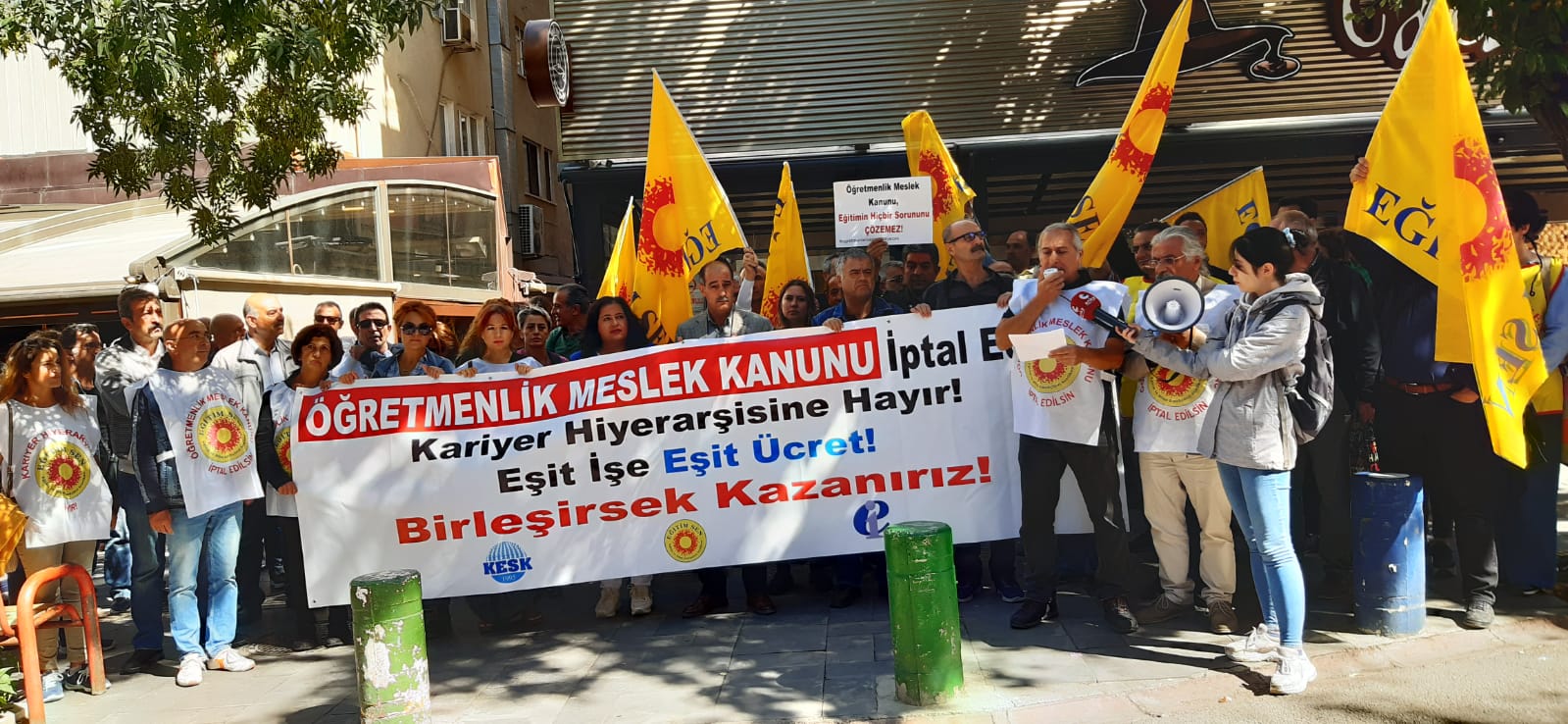 Öğretmenlik Meslek Kanunu’yla birlikte gelen kariyer basamakları sınavının başvurusu öncesinde Eğitim ve Bilim Emekçileri Sendikası (Eğitim Sen) yurdun dört bir yanında sokağa çıktı.