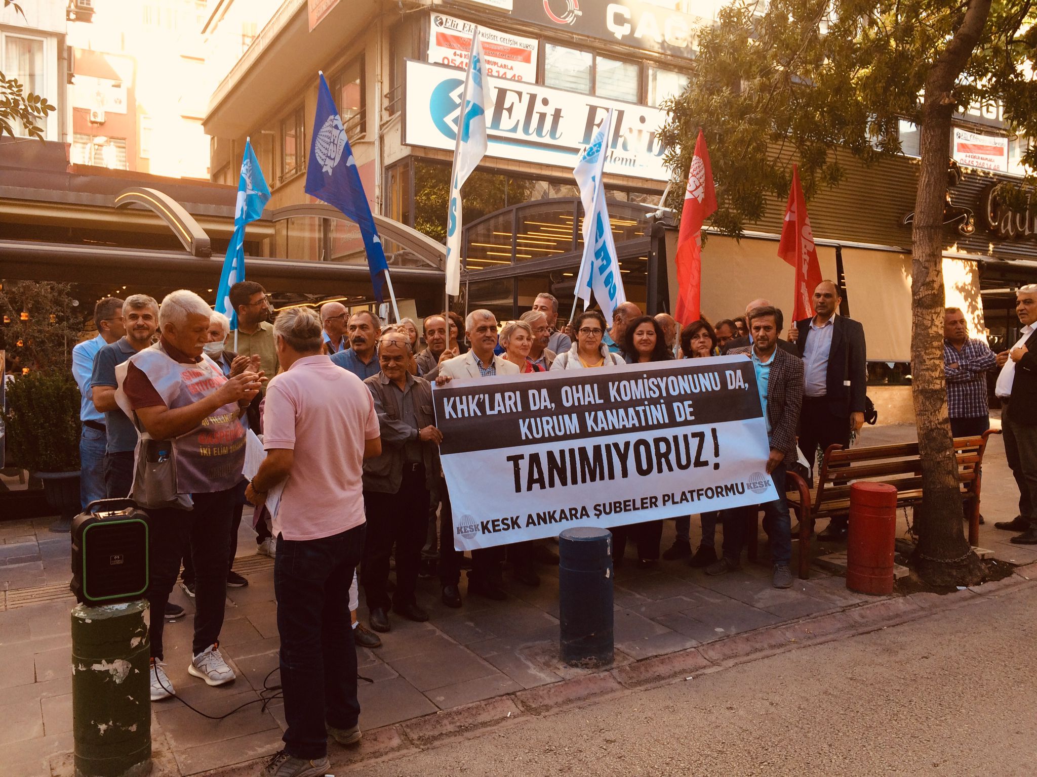 KESK Ankara Şubeler Platformu, Eğitim Sen 1 Nolu Şube önünde “KHK’ları da OHAL komisyonunu da kurum kanaatini de tanımıyoruz” diyerek açıklama yaptı.Açıklamada 15 Temmuz’dan sonra yayımlanan KHK’lar ile başlatılan “karşı darbe” ile 125 bin 678 kamu görevlisinin ihraç edildi. OHAL Komisyonu’nun, soruşturma açılmadan, savunma alınmadan ve yargı kararlarına dayanmayan ihraç kararları ile 4 bin 761 KESK üyesinin de olduğu kamu görevlilerinin adalete erişimlerinin engellenmesi için oluşturulduğu belirtildi.
