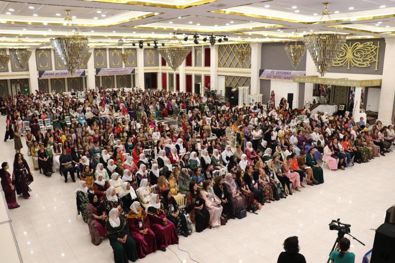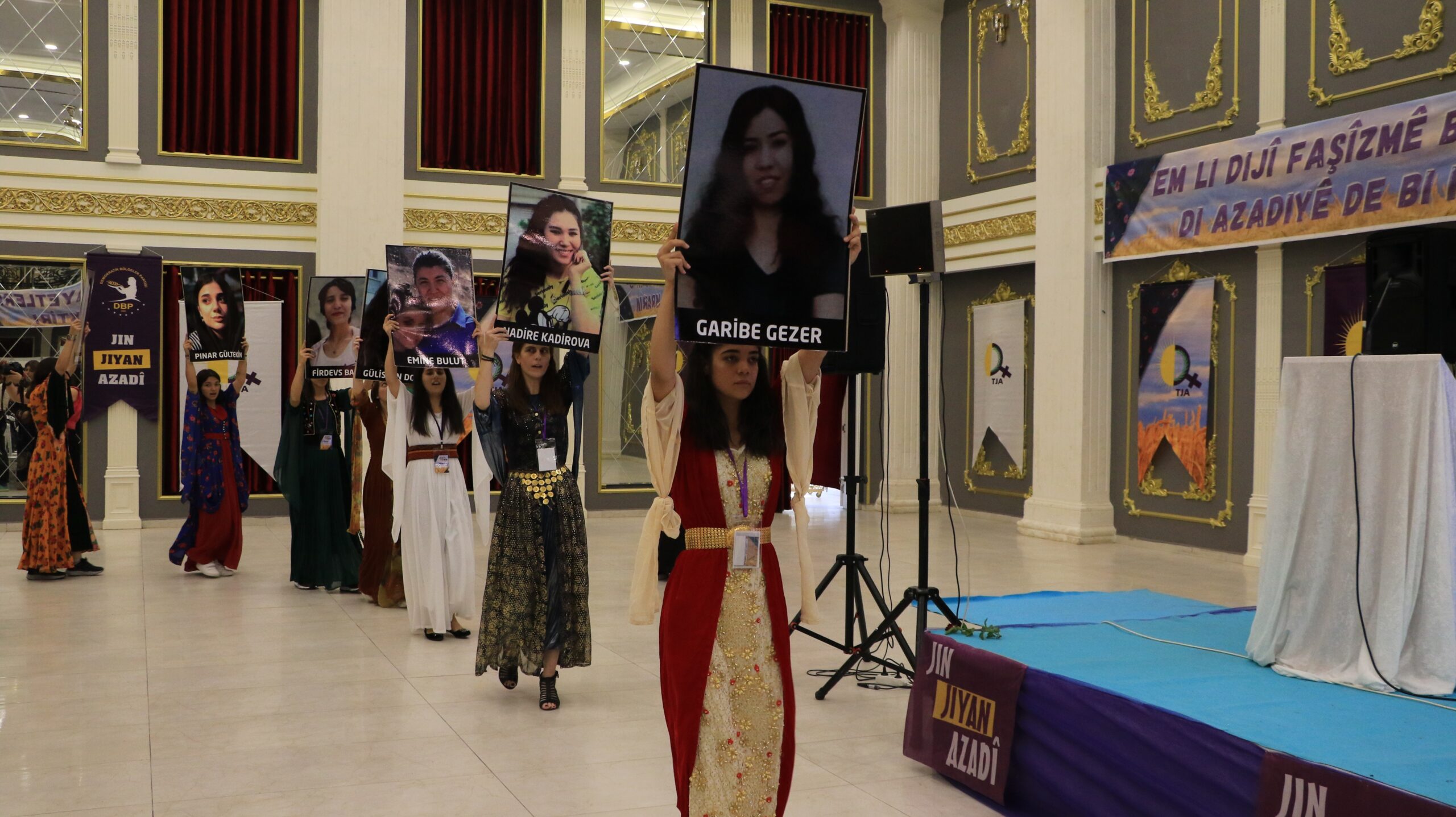 Rengarenk kıyafetleriyle salonu dolduran kadınlar, çeşitli tarihlerde katledilen İpek Er, Deniz Poyraz, Pınar Gültekin, Firdevs Babat, Gülistan Doku, Geribe Gezer ve Mahsa Amini’nin fotoğraflarını taşıdı. Konferansta ayrıca kadın mücadelesini konu alan sinevizyon gösterimi yapıldı.
