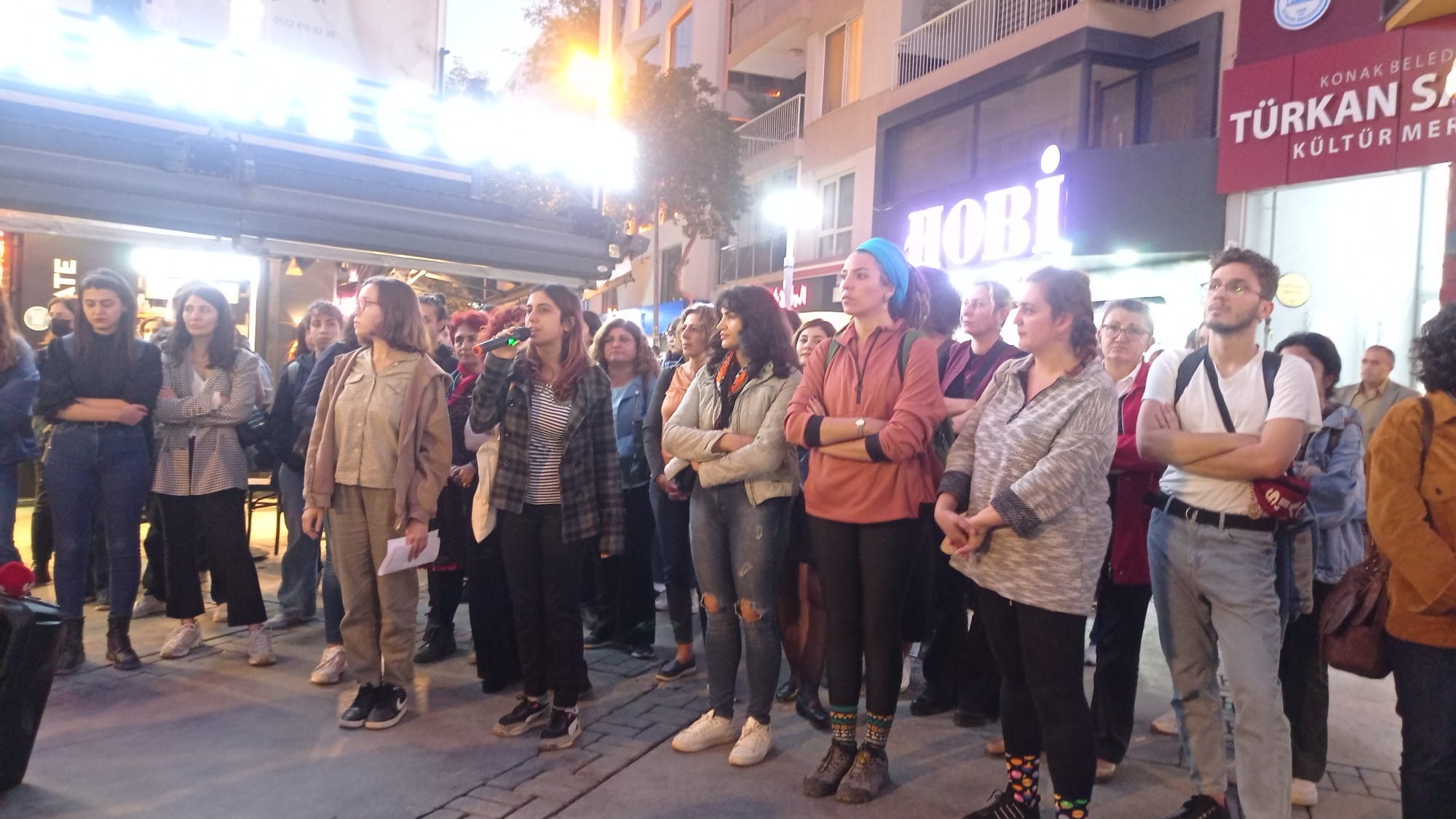 İzmir Kadınlar Birlikte Güçlü’nün çağrısıyla saat 18.30’da Alsancak Türkan Saylan Kültür Merkezi önünde bir araya gelenler basın açıklaması yaptı