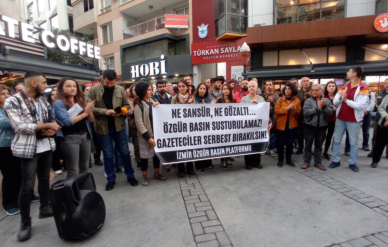 11 gazetecinin gözaltına alınmasına karşı İzmir Alsancak Türkan Saylan Kültür Merkezi önünde bir araya gelen İzmir Özgür Basın Platformu üyeleri, “Gözaltındaki ve tutuklu meslektaşlarımızın da dediği gibi gerçekleri yazmaktan, halkın doğru ve özgür haber alma hakkını savunmaktan asla vazgeçmeyeceğiz. Buradan bir kez daha söylüyoruz; gazetecilik suç değildir” dedi