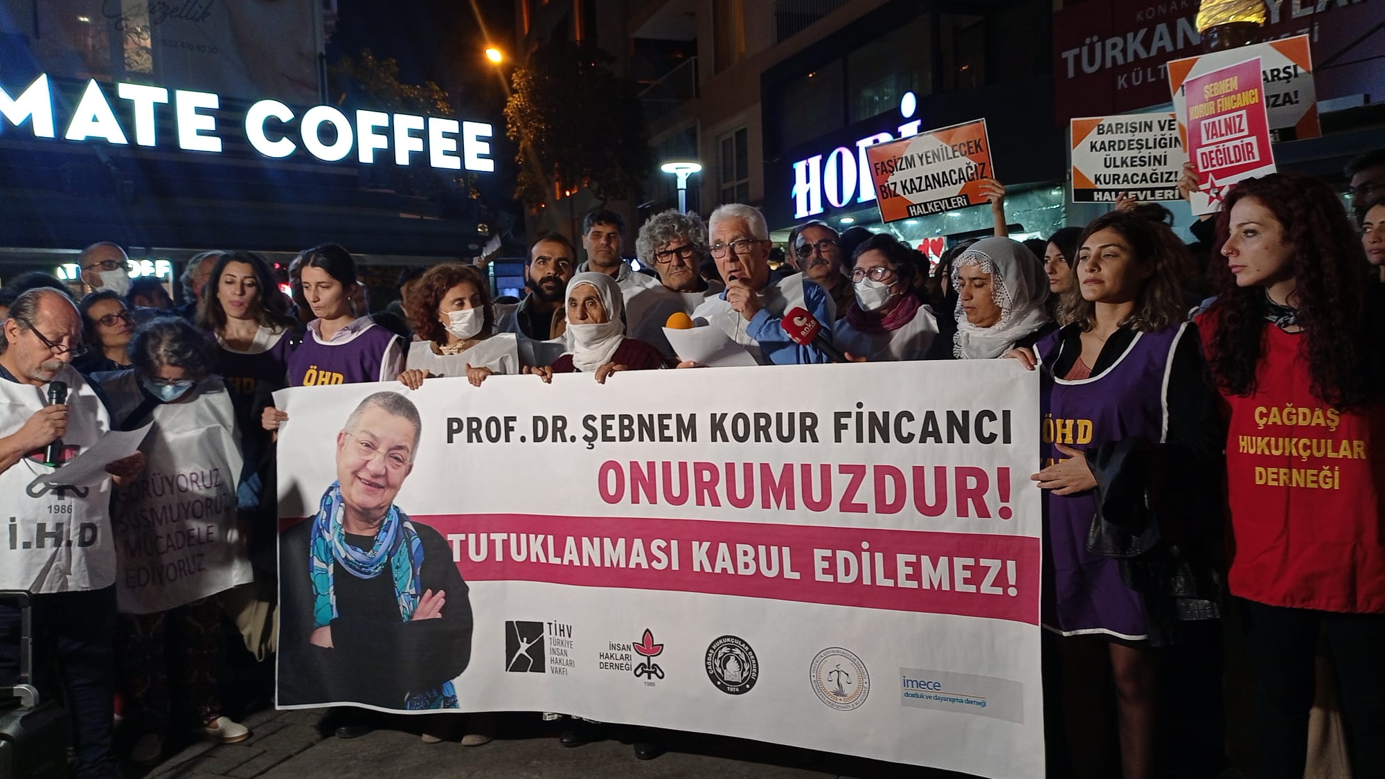 İzmir’de Türkan Saylan Kültür Merkezi önünde TİHV İzmir Şubesi, İHD İzmir Şubesi, ÖHD İzmir Şubesi, ÇHD İzmir Şubesi, İMECE Der tarafından tutuklama kararı verilen TTB Merkez Konseyi Başkanı Şebnem Korur Fincancı için bir açıklama yapıldı.