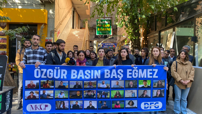 DFG Eş Başkanı Dicle Müftüoğlu, “Türkiye Cumhuriyeti yüz yaşına girdi ama demokrasinin, düşünce ve ifade özgürlüğünün olmazsa olmazı olan basın özgürlüğü ayaklar altında. Cumhuriyet’in 100 yaşına bastığı 29 Ekim gününün şafağında bile 9 gazeteci tutuklandı” diye belirtti. “Alın size Cumhuriyet’in karnesi!” diyen Müftüoğlu, “Sadece son beş ayda Kürt basınına yapılan siyasi iktidar organize operasyonlar sonucu 26 gazeteci tutuklandı. Hem de alındıkları evlerinden cezaevine kadar işkence gördüler. Elleri ters kelepçelenmiş, başları zorla eğdirilmek istenen gazetecilerin görüntüleri de bizzat emniyet tarafından servis edilerek, geriye kalanlara mesaj verilmiştir. Mesleğinin başında, haberlerin peşinde, hakikatin izinde olan biz gazeteciler, mesajı aldık ve diyoruz ki: Asıl siz korkun, cesareti bilenmişlere asla baş eğdiremezsiniz! Ve korkunun ecele faydası yok, bir gün mutlaka ama mutlaka bu utancın hesabını başınızı eğe eğe vereceksiniz” diye konuştu.