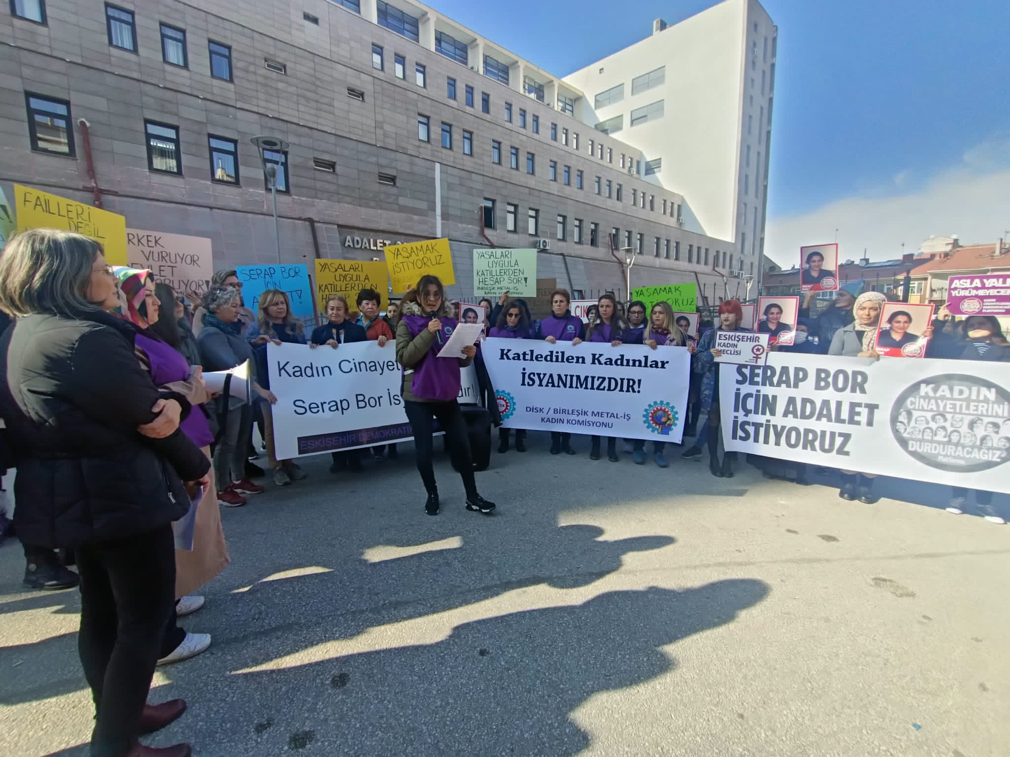 Eskişehir Demokratik Kadın Platformu, Kadın Cinayetlerini Durduracağız Platformu ile birlikte Birleşik Metal İş Kadın Komisyonunun katılımıyla Serap Bor için adliye önünde basın açıklaması yaptı.