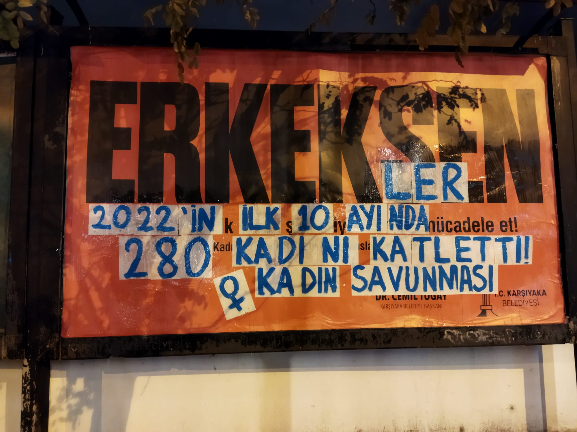 Kadın Savunması’ndan Karşıyaka Belediyesi’nin “Erkeksen” panolarına kadınlardan düzeltmeler: “Erkek şiddetine karşı 25 Kasım’da sokağa”, “Erkekler 2022’nin ilk 10 ayında 280 kadını katletti”