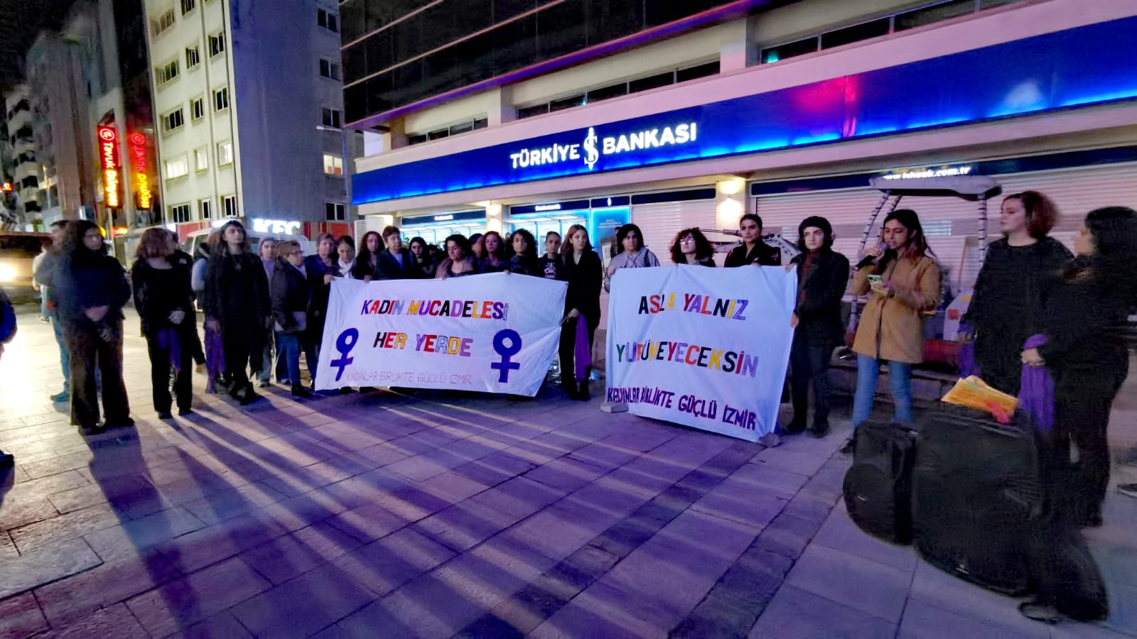 Kadınlar Birlikte Güçlü İzmir, 25 Kasım Kadına Yönelik Şiddete Karşı Uluslararası Mücadele Günü’ne ilişkin Karşıyaka çarşıda açıklama yaptı. “Kadın mücadelesi her yerde” ve “Asla yalnız yürümeyeceksin” pankartlarının açıldığı eylemde, sık sık “Susmuyoruz korkmuyoruz itaat etmiyoruz”, “Dünyada direnen kadınlara bin selam”, “Jin jiyan azadi”, “Kadınlar birlikte birlikte güçlü”, “Yaşasın kadın dayanışması” ve “Dünyayı yerinden oynatacağız” sloganları atıldı. Basın açıklamasını kadınlar adına Deniz Uslu okudu.