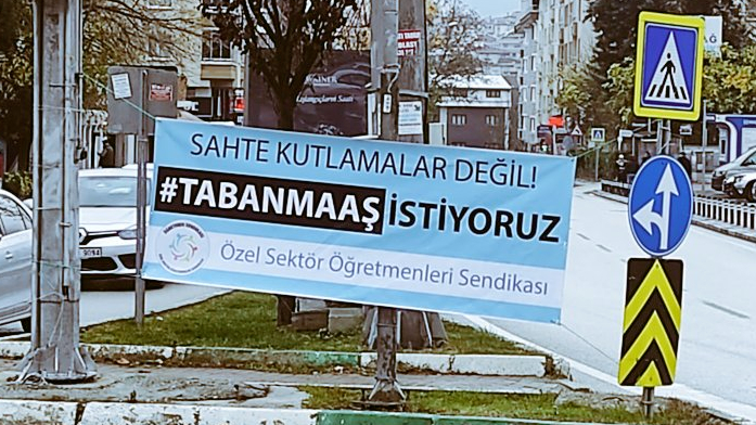 Milli Eğitim Bakanlığı’nın (MEB) 24 Kasım kutlama mesajı, taban maaşı taleplerine aylardır kulak tıkanan özel sektörde çalışan öğretmenlerin tepkisiyle karşılaştı. “Sahte kutlamalar değil, taban maaş istiyoruz” diyen Özel Sektör Öğretmenleri Sendikası (Öğretmen Sendikası), 24 Kasım’a dair bir açıklama yaparken çeşitli illerde taban maaş taleplerini hatırlatan pankartları da kentlerin çeşitli bölgelerine astı.