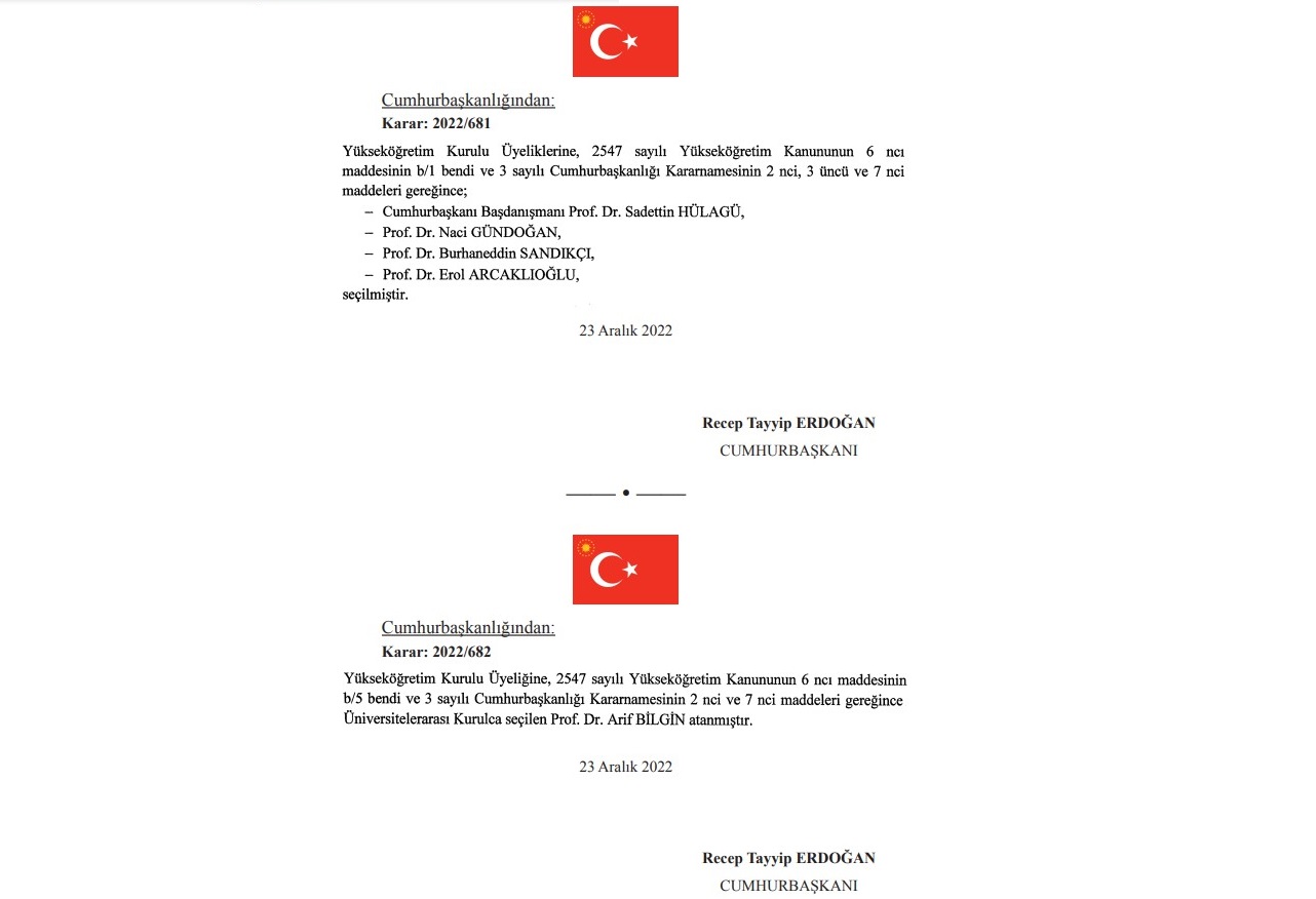 AKP Genel Başkanı ve Cumhurbaşkanı Recep Tayyip Erdoğan’ın imzasıyla yayımlanan karara göre, Yükseköğretim Kurulu üyeliklerine, Cumhurbaşkanı Başdanışmanı Prof. Dr. Sadettin Hülagü, Prof. Dr. Naci Gündoğan, Prof. Dr. Burhaneddin Sandıkçı, Prof. Dr. Erol Arcaklıoğlu ile Üniversitelerarası Kurulca seçilen Prof. Dr. Arif Bilgin atandı.