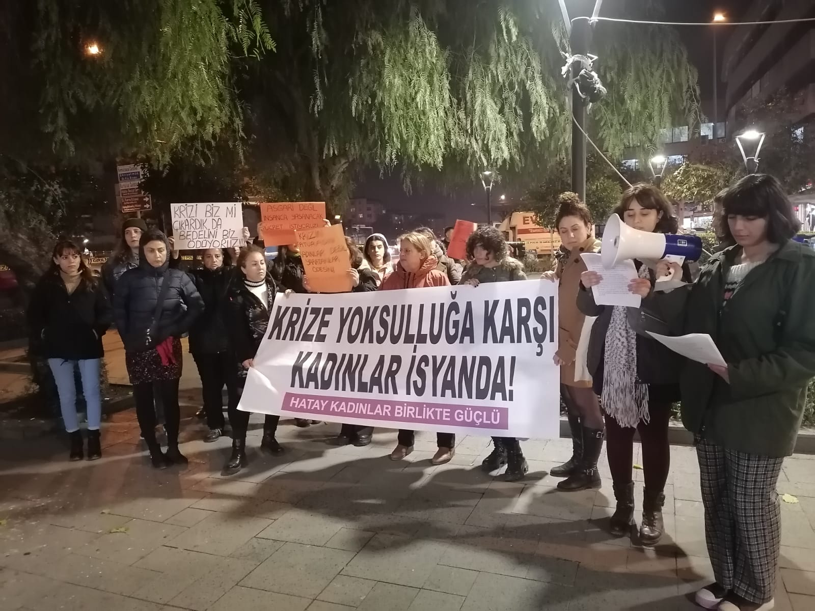 Hatay Kadınlar Birlikte Güçlü’nün çağrısıyla bugün (21 Aralık) saat 18.00’de Künefeciler Meydanı’nda bir araya gelenler “Krize yoksulluğa karşı kadınlar isyanda” yazılı pankart açarak eylem yaptı.