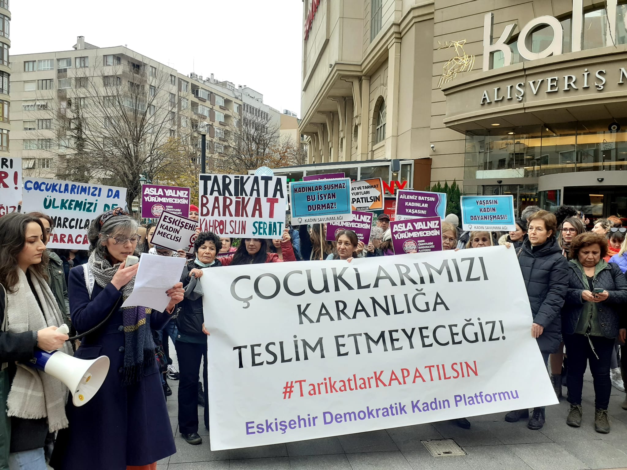 Eskişehir Demokratik Kadın Platformu’nun çağrısıyla Kanatlı AVM önünde toplanan kadınlar basın açıklaması yaptı. Yapılan açıklamada tarikat ve cemaatlerin işlediği suçların hasıraltı edilmeye çalışıldığı ve suçların münferit bir vaka olarak gösterilmeye çalışıldığı ifade edildi. Dayatılan gerici zihniyeti kabul etmediklerini ifade eden kadınlar laik, eşit ve demokratik bir eğitim, özgür bir dünya için mücadelelerinin süreceğini belirterek açıklamayı sonlandırdı.