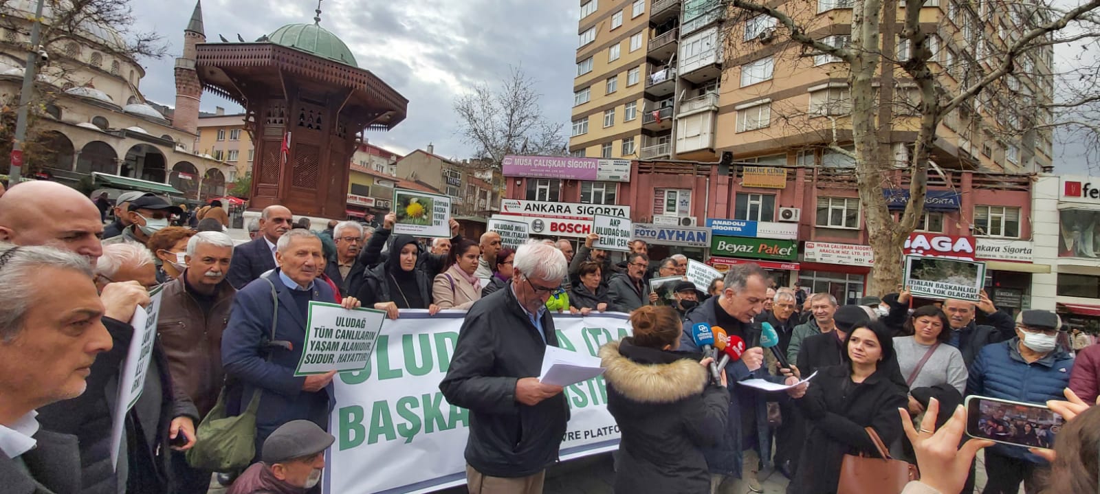 Bursa Çevre Platformu’nun çağrısıyla Fomara Meydanı’nda buluşan yaşam savunucuları, Uludağ’ın Alan Başkanlığı’na devredilmemesi, milli park olarak kalması gerektiğini ifade etti