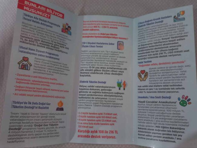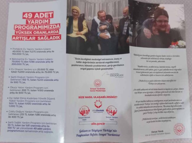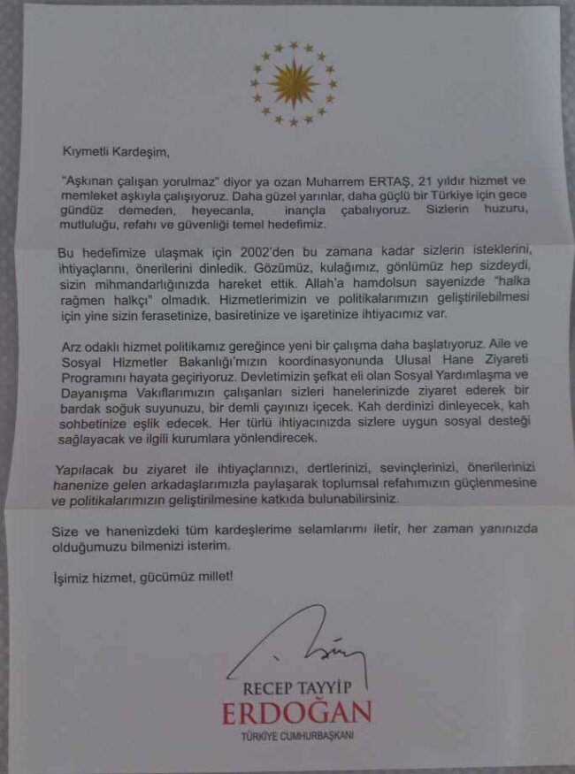 Bu ziyaretleri yapacak memurlara verilecek zarfta Erdoğan imzalı bir mektup ve AKP övgüleri olduğu öğrenilirken, Pehlivan, “Az daha unutuyordum… Erdoğan çiftinin bir aileyle fotoğrafının yer aldığı broşür de ziyaret edilen evlere o mektubun yanında dağıtılıyor. Nihayetinde öğrendim ki sosyal hizmetler merkezlerindeki tüm personel artık kendisini AKP çalışanı gibi hissediyor. Öyle ya, memur olsalar da seçime kadar kapı kapı dolaşıp hükümet için oy toplamaya zorlanıyorlar” dedi.