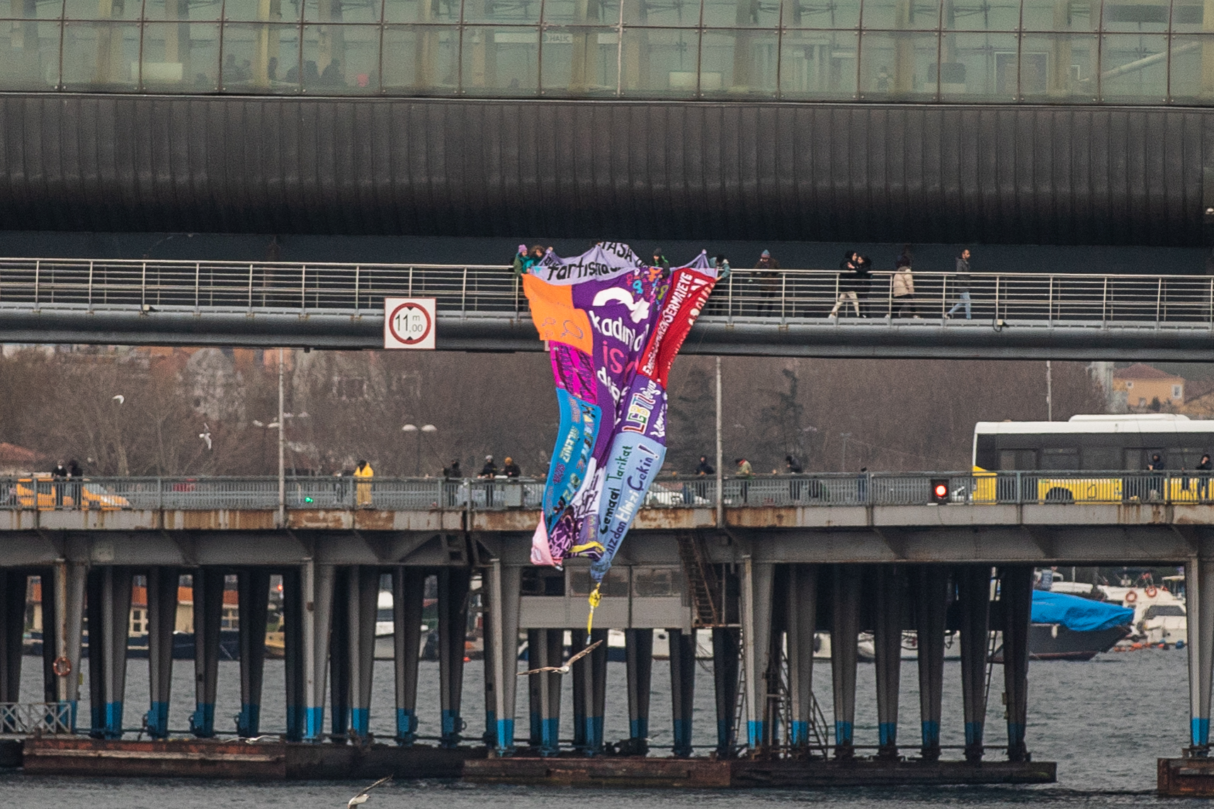 Kadınlar Birlikte Güçlü’nün mahalle mahalle hazırlayıp 8 Ocak’ta birbirine diktiği pankartlar İstanbul semalarında