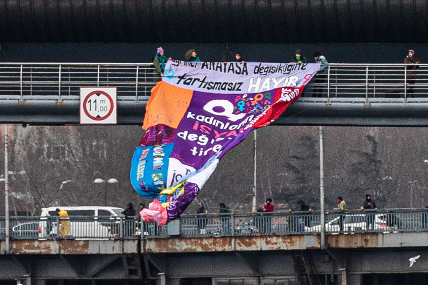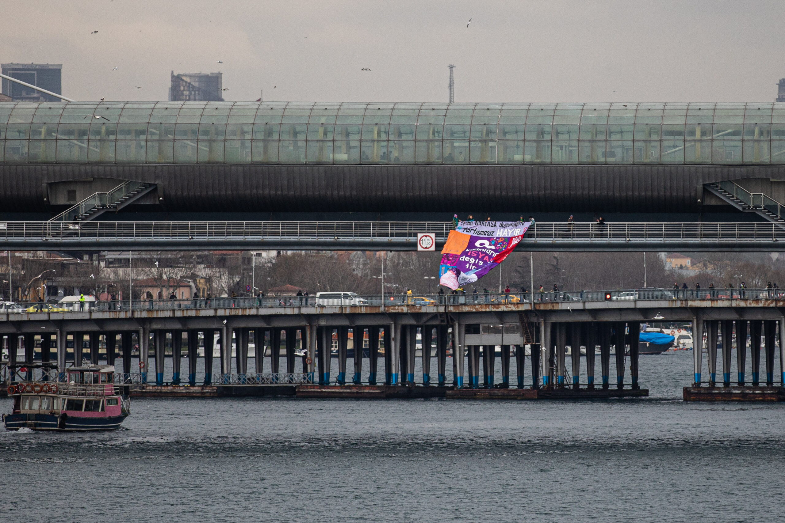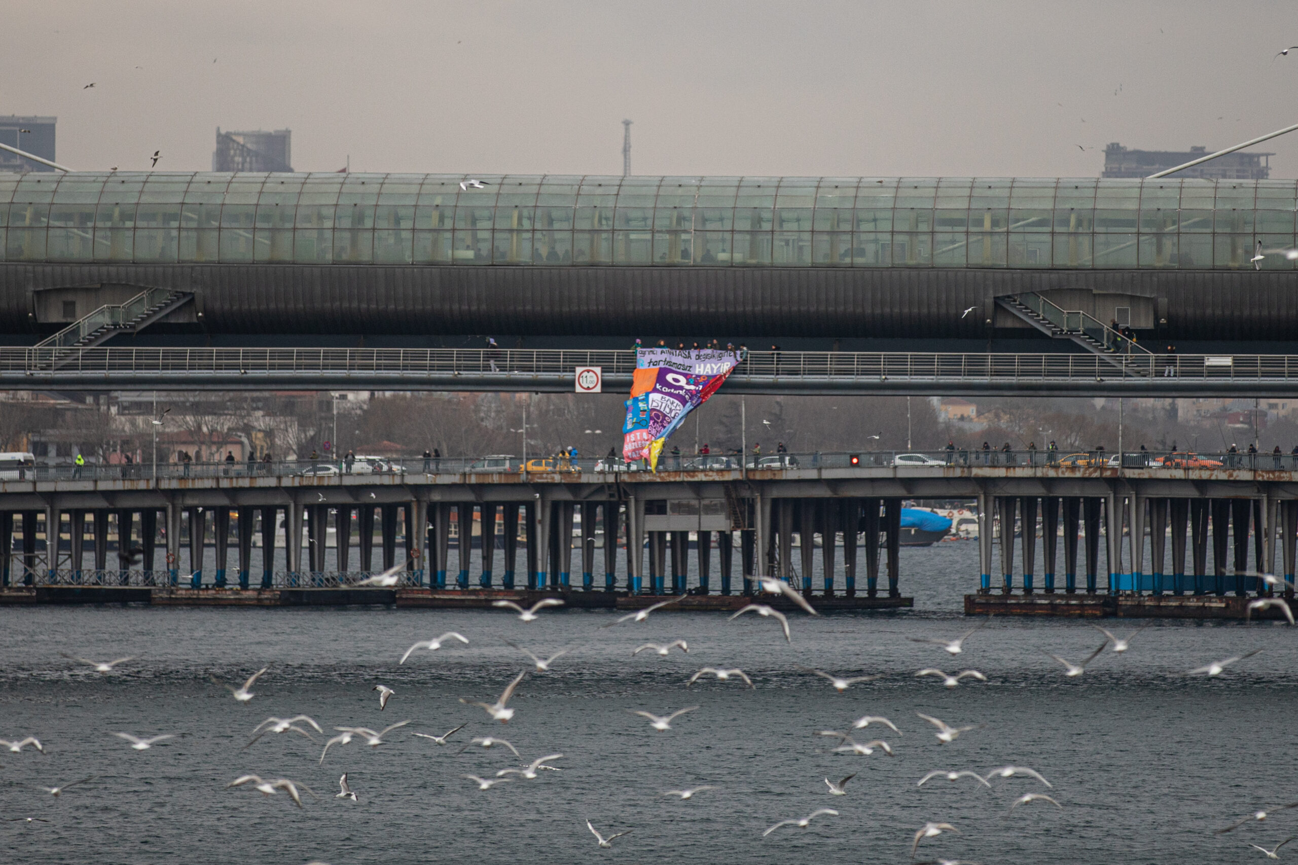 “Kadınların isyanı değiştirecek” diyenleri 5 Şubat’ta Şişli Nazım Hikmet Kültür Merkezi’ne çağıran Kadınlar Birlikte Güçlü, Haliç metro köprüsüne bir pankart astı.