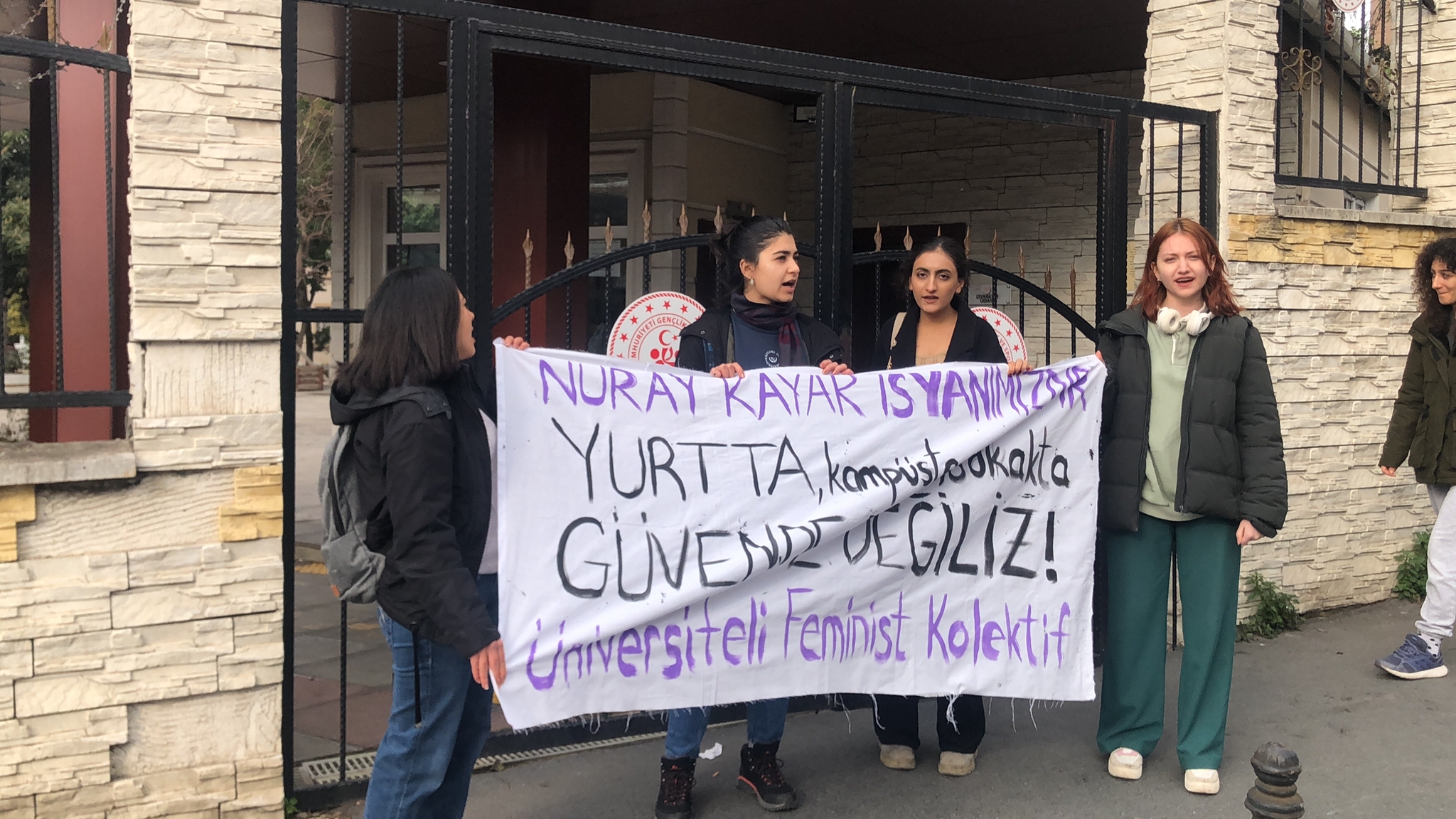 “Nuray Kayar isyanımızdır” sloganını atan Üniversiteli Feminist Kolektif üyeleri “Yurtta, kampüste, sokakta güvende değiliz!” yazılı bir pankart açtı.