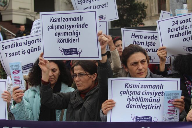DİSK Genel-İş Sendikası’nın 8 Mart için hazırladığı 2022 Kadın Emeği Raporu’nda, kadınların istihdama katılım oranı yüzde 29 olarak tespit ediliyor. OECD ülkeleri ortalamasında istihdamda cinsiyet açığı yüzde 14,5, AB ülkeleri ortalamasında yüzde 10 iken, Türkiye’de yüzde 39,1 olduğu görülüyor. Yine her 10 kadından 3’ü kayıtdışı çalışırken, 1,2 milyondan fazla kadının hem yarı zamanlı hem de kayıtdışı çalıştırıldığı görülüyor. Aynı rapora göre erkekler kadınlardan yüzde 27,4 daha fazla kazanıyorlar.